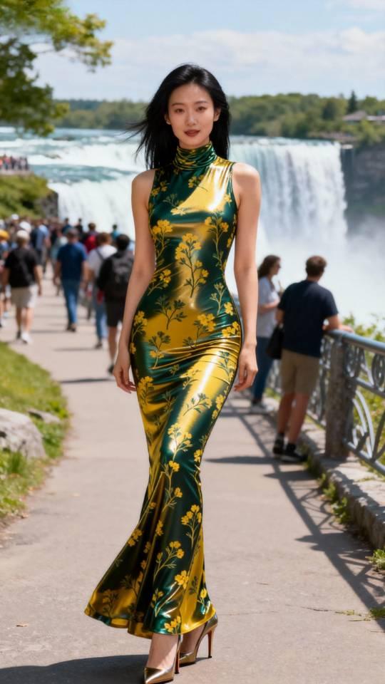 旗袍裙美女瀑布前留影。旗袍 美女壁纸