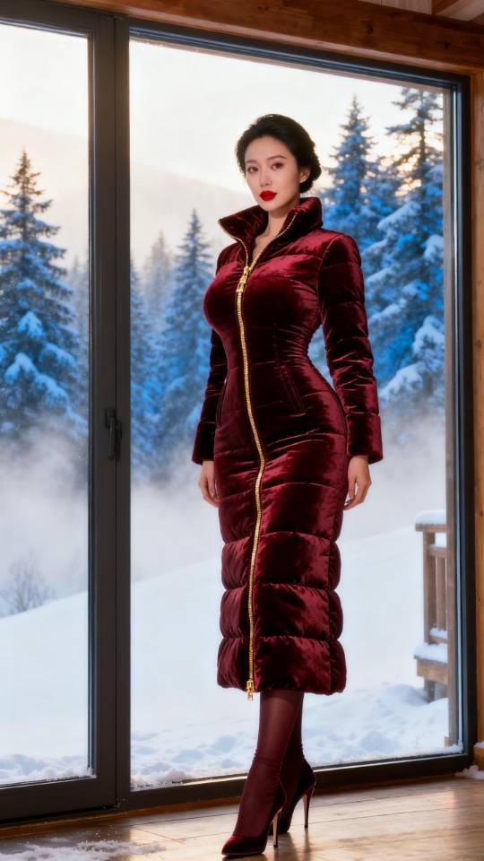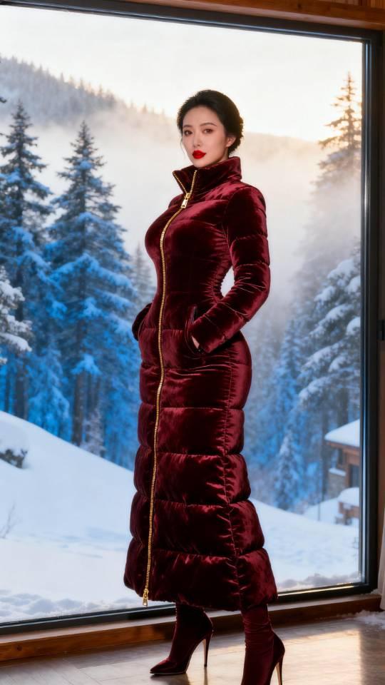 羽绒服女子雪景留影。羽绒服 美女壁纸