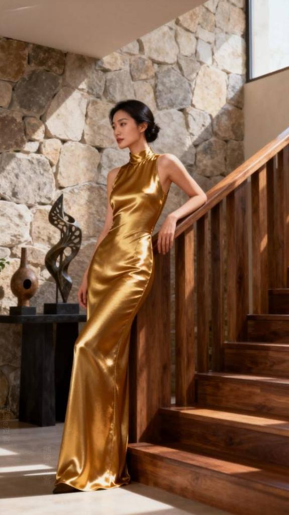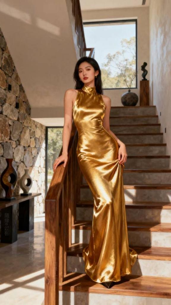 金色连衣长裙,可作晚礼服,可作晨袍,可作家居服。晚礼服 连衣裙