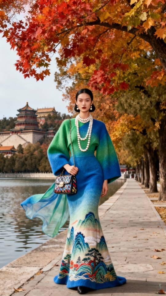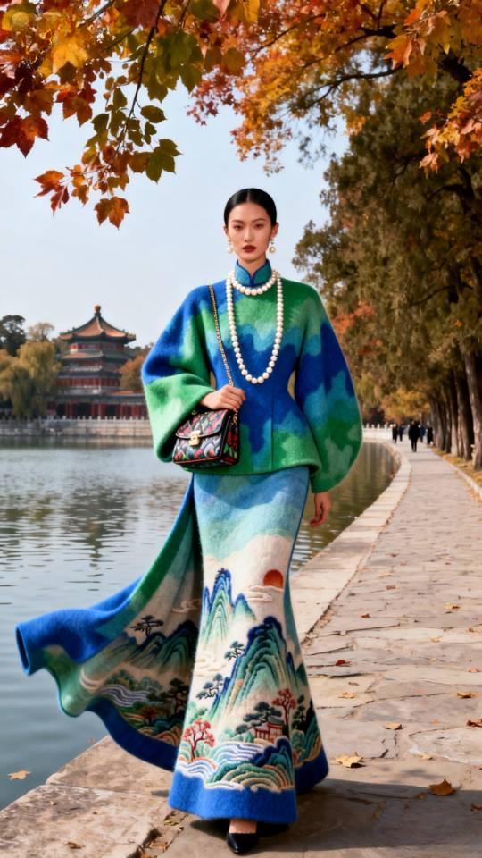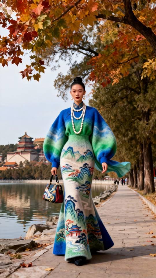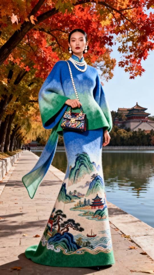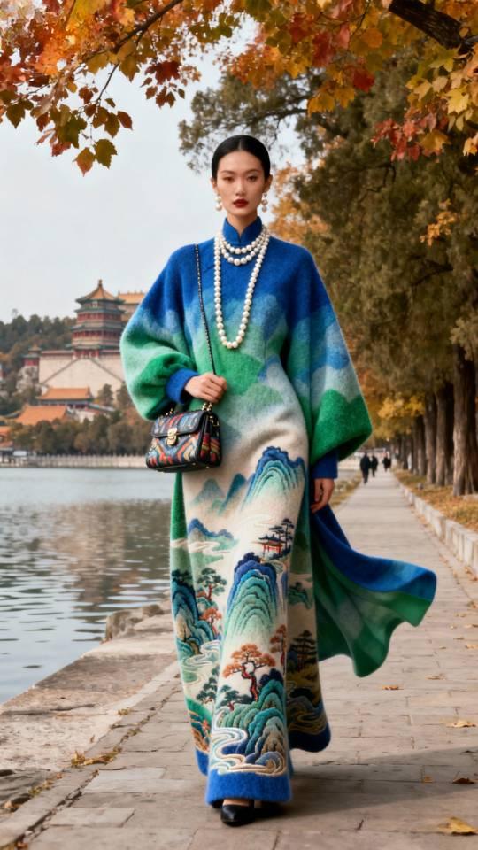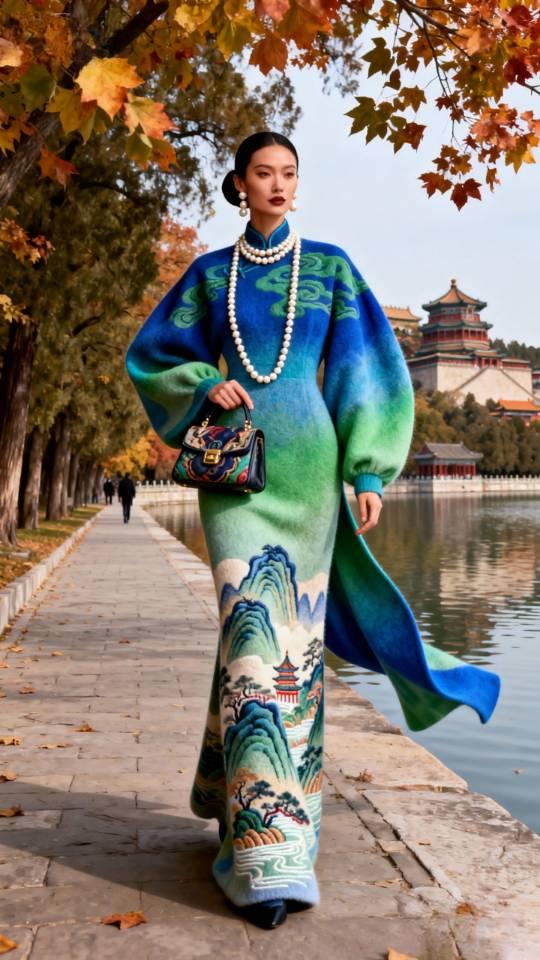 模特展示千里江山图毛线针织衣裙系列。毛线裙 模特 连衣裙 毛线衣裙