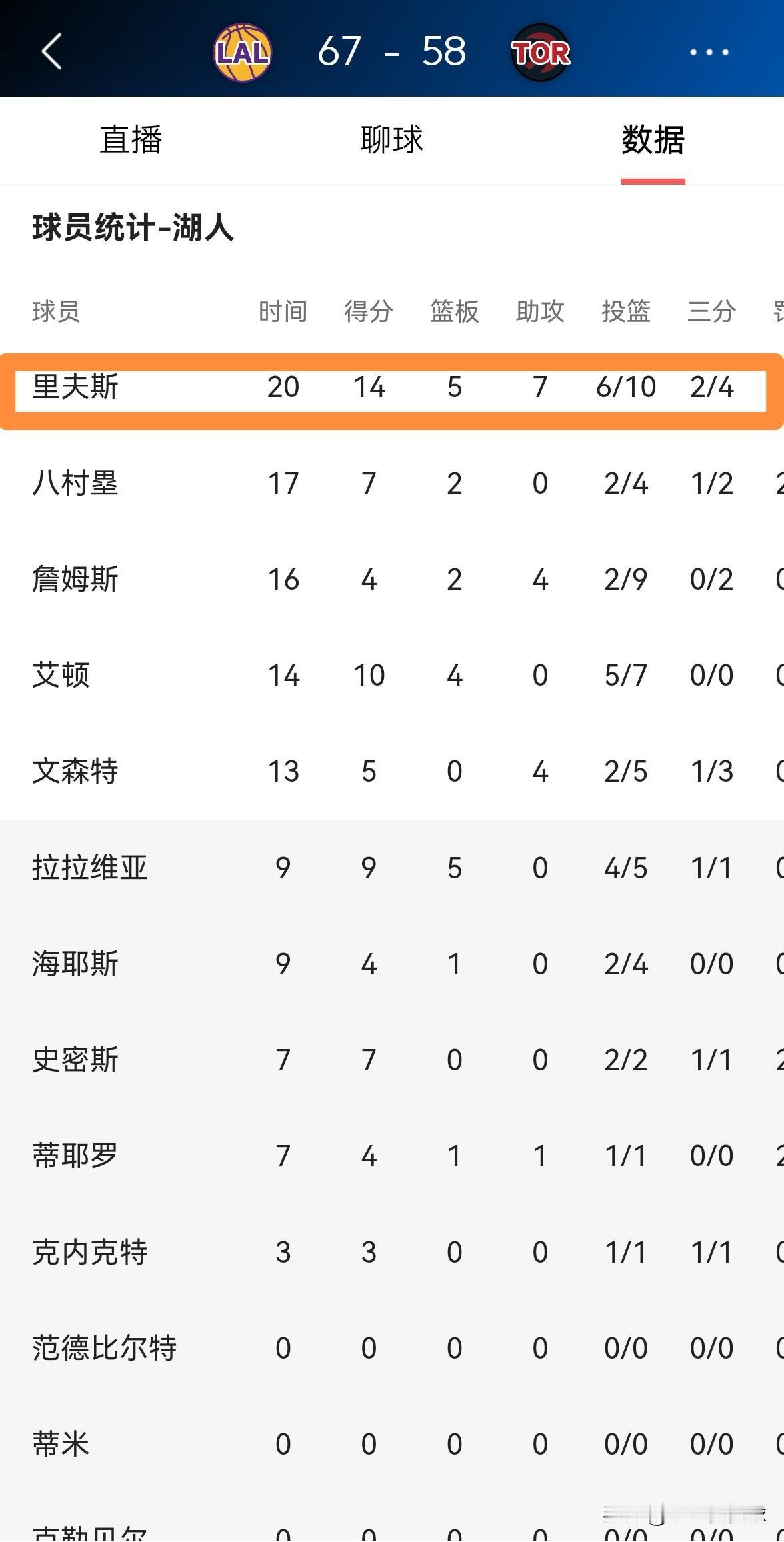 湖人三当家里弗斯终于找到了当老大的感觉!在今天湖人客场挑战猛龙的上半场比赛中,里弗斯在东契奇缺阵的情况下成为了球队的第一进攻核心,他在首发出战的20分钟里,投篮10中6,其中三分球4中2得到14分5篮板7助攻,他的场上正负值为全队最高的+13。