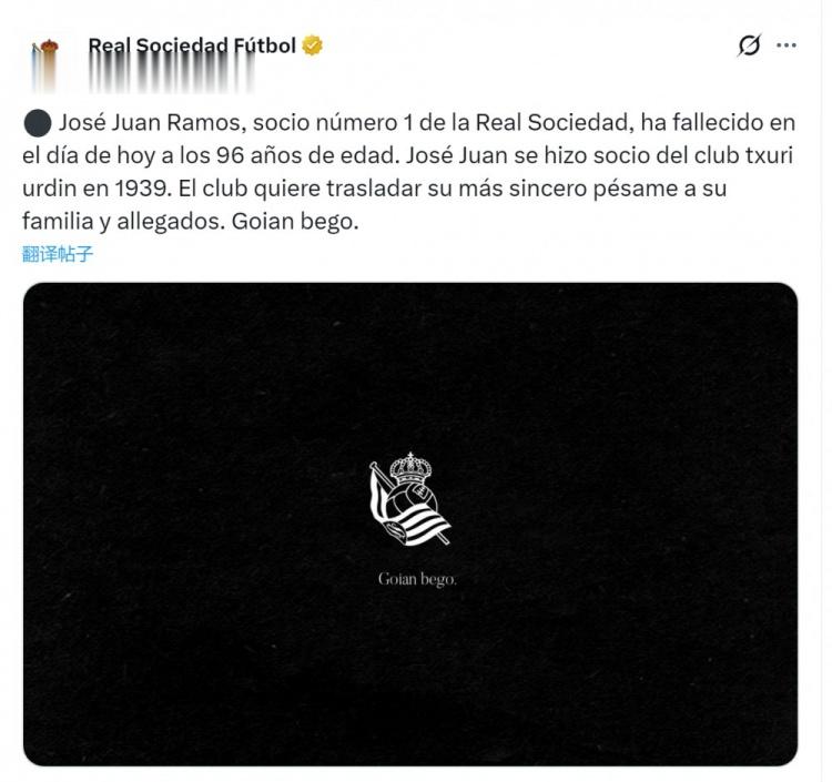 皇家社会官方社媒写道:“皇家社会俱乐部1号会员何塞·胡安-拉莫斯今日逝世,享年96岁,何塞·胡安于1939年成为俱乐部会员,皇家社会向其家人及亲友致以最深切的慰问,愿他安息。”