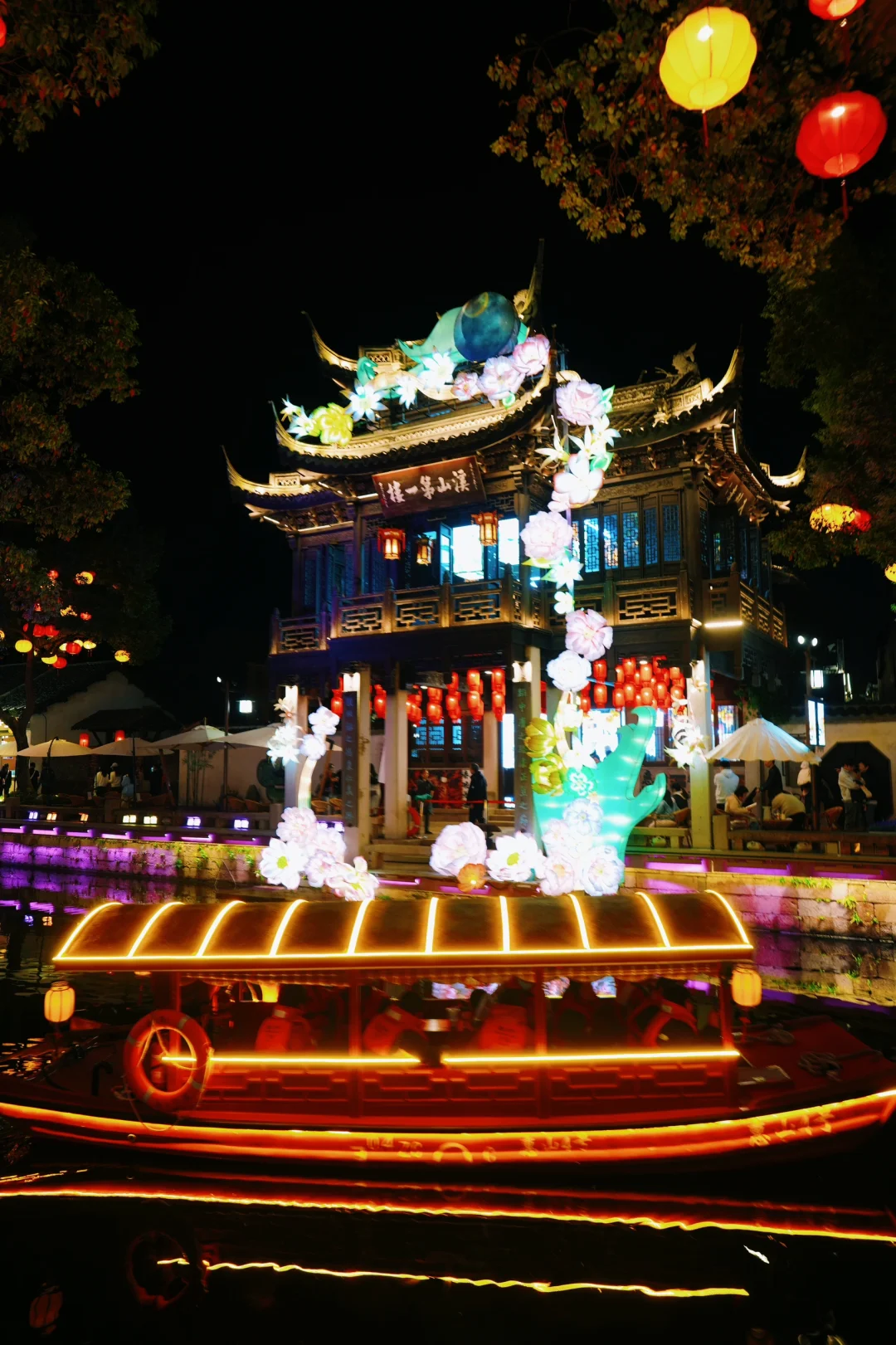 傍晚古镇灯笼亮起,青石板路+古运河夜景,氛围比白天更温柔。