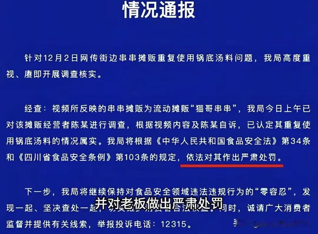 成都春熙路串串店恶心操作,老板回收剩锅底还威胁游客,结局大快人心 有博主去成都春熙路吃串串,吃到一半发现老板把邻桌吃剩的汤料倒进新锅接着用,瞬间就觉得胃里翻江倒海。 博主找老板理论,结果老板非但不认错,还放狠话:“你要是让我没法做生意,我就让你们在成都耍不开心!” 更离谱的是,他还说自己这么干了二三十年,就外地人才不习惯,甚至扬言这片区域没人敢找他事。这到底是黑心商家还是黑恶势力啊? 不过博主没怕他,直接打12345投诉了。人家可不是想抹黑成都,就是不想让其他游客也踩这坑。 当地市场监督管理局很快就介入了,当天就去调查核实。一查还真属实,那个流动摊贩“猫哥串串”的老板陈某被依法严肃处罚了。市场监管局还说,以后对这种食品安全违法违规行为零容忍,发现一起查一起。 说实话,要是这老板当时不甩锅、不威胁,当场认错悔改,也不至于落得这个下场。所以啊,咱们出去吃饭得多留个心眼,遇到这种事别惯着,该投诉就投诉。成都本身是个好地方,可不能让这种无良商家坏了名声