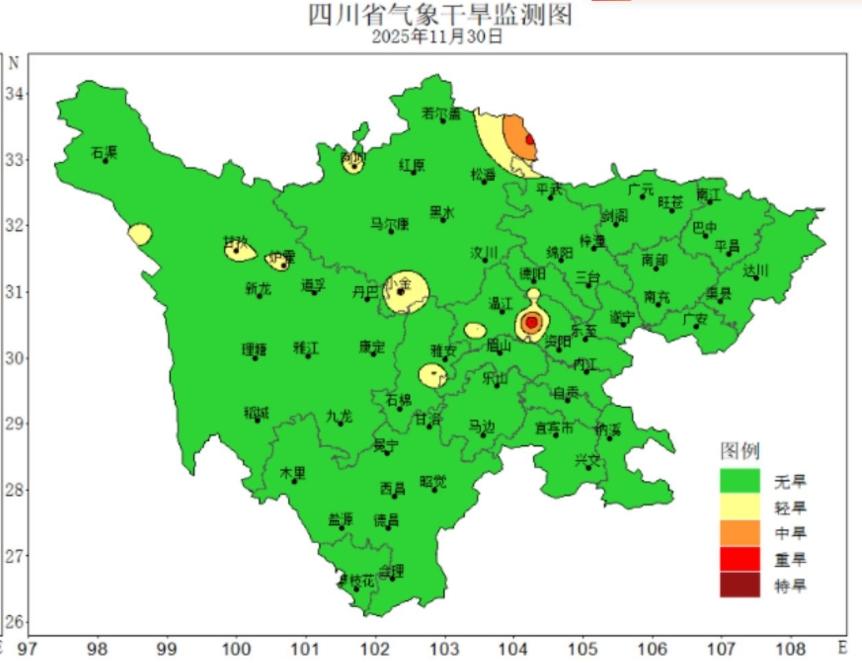 气象监测显示,11月,四川全省平均气温10.6℃,相比常年同期偏低0.3℃,主要呈西部偏高东部偏低的空间分布;全省平均降水量27.2毫米,相比常年同期偏多20%,大致呈东北少西南多的空间分布。省内大部农区温度偏低且波动频繁,但光温水条件匹配较好,总体农业气象条件利大于弊。截至11月30日,在全省156个国家气象观测站中,有10站气象干旱持续,其中轻旱4站、中旱4站、重旱1站(九寨沟站)、特旱1站(龙泉驿站)。