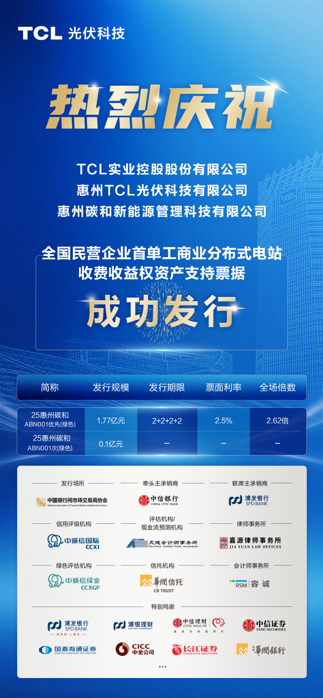 近日,TCL光伏科技旗下项目公司——惠州碳和新能源管理科技有限公司2025年度第一期绿色定向资产支持票据(ABN)已成功在中国银行间市场交易商协会完成注册,注册规模人民币5亿元,本期发行金额1.87亿元,标志着TCL光伏科技在绿色金融创新与资本运作方面实现关键突破。