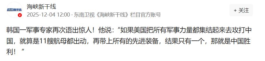 韩国专家再次语出惊人!2025年12月4日报道,韩国专家:如果美国把所有军事力量都集中起来去攻打中国,就算是11艘航母出动,再带上所有先进装备,结果只有一个! 建国以来,我国一直在加大军事装备的研发。在历经多年之后,我国的军事实力得到了飞速的提升。 据了解,目前我国的军事实力在国际中都已经位列前茅。而且最重要的是,中国在财政,军队数量等一些方面更是具备着优势。 但是因为我国一直没有参与到国际冲突中,所以国际也无法预测中国的军事实力,到底到达了什么程度?就在近日,韩国一位军事专家的预言则引起了极大的热度。 2025年12月4日,据媒体报道,韩国一位军事专家指出。如果美国把所有的军事力量都集中起来去攻打中国,就算是11艘航母都出动,再带上所有的先进装备,结果都只会有一个,那就是中国胜利! 他的这番言论之所以会引起轰动,是因为有部分言论认为他过于夸张。虽然当下的美国军事发展同过去相比有点落后,但在国际军事装备中还具有领先。所以中美之间爆发战争,很难去预测哪方胜利! 但也有部分言论认为,他说的这番话过于准确。一军事专家说出的结果,有一个前提是美国把所有的军事力量都集结起来,去攻打中国。 也就是说主战场不会是在美国附近,而会是在中国附近。届时对于美国来说,还要面临后勤供应等一系列的难题。所以在这个前提下,中国会完胜美国。 对此您怎么看?欢迎评论区留言,您的看法,我们一起讨论一下。 (信息来源:韩国一军事专家再次语出惊人!……-海峡新干线)