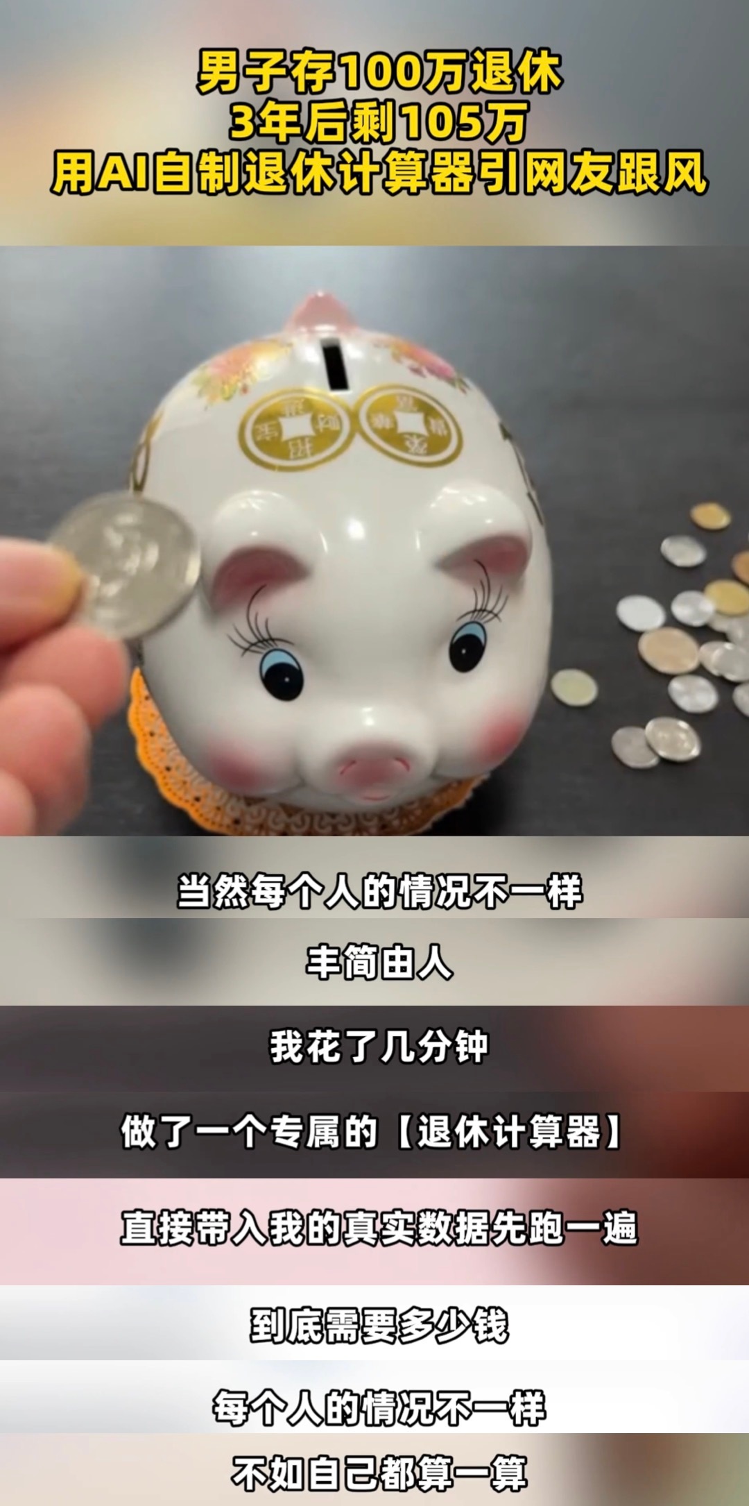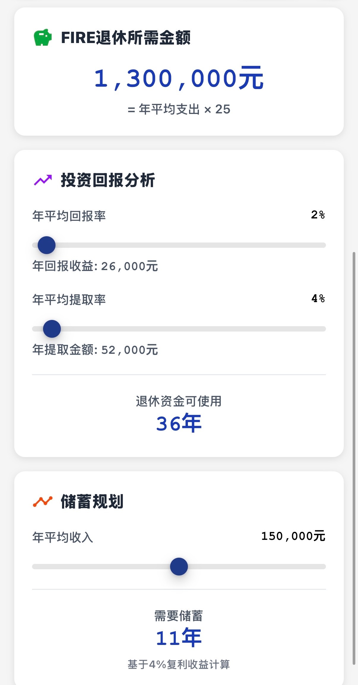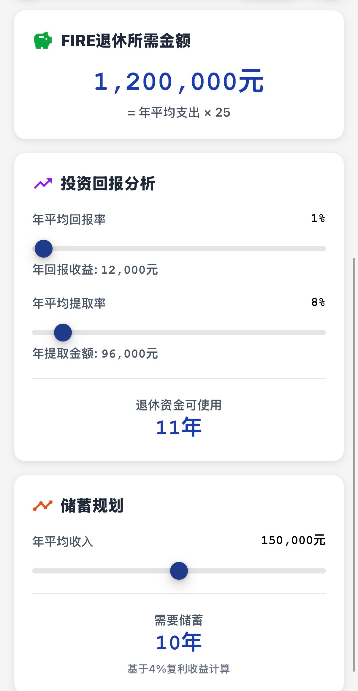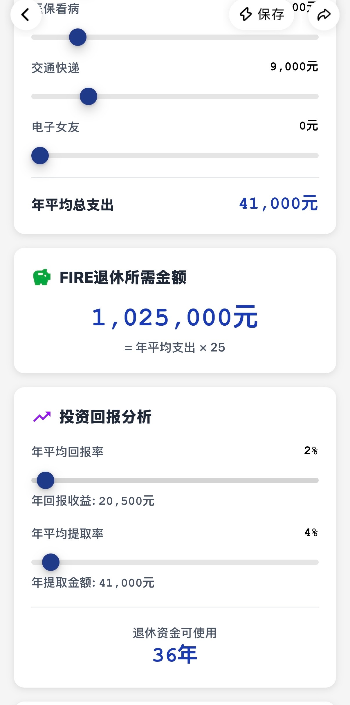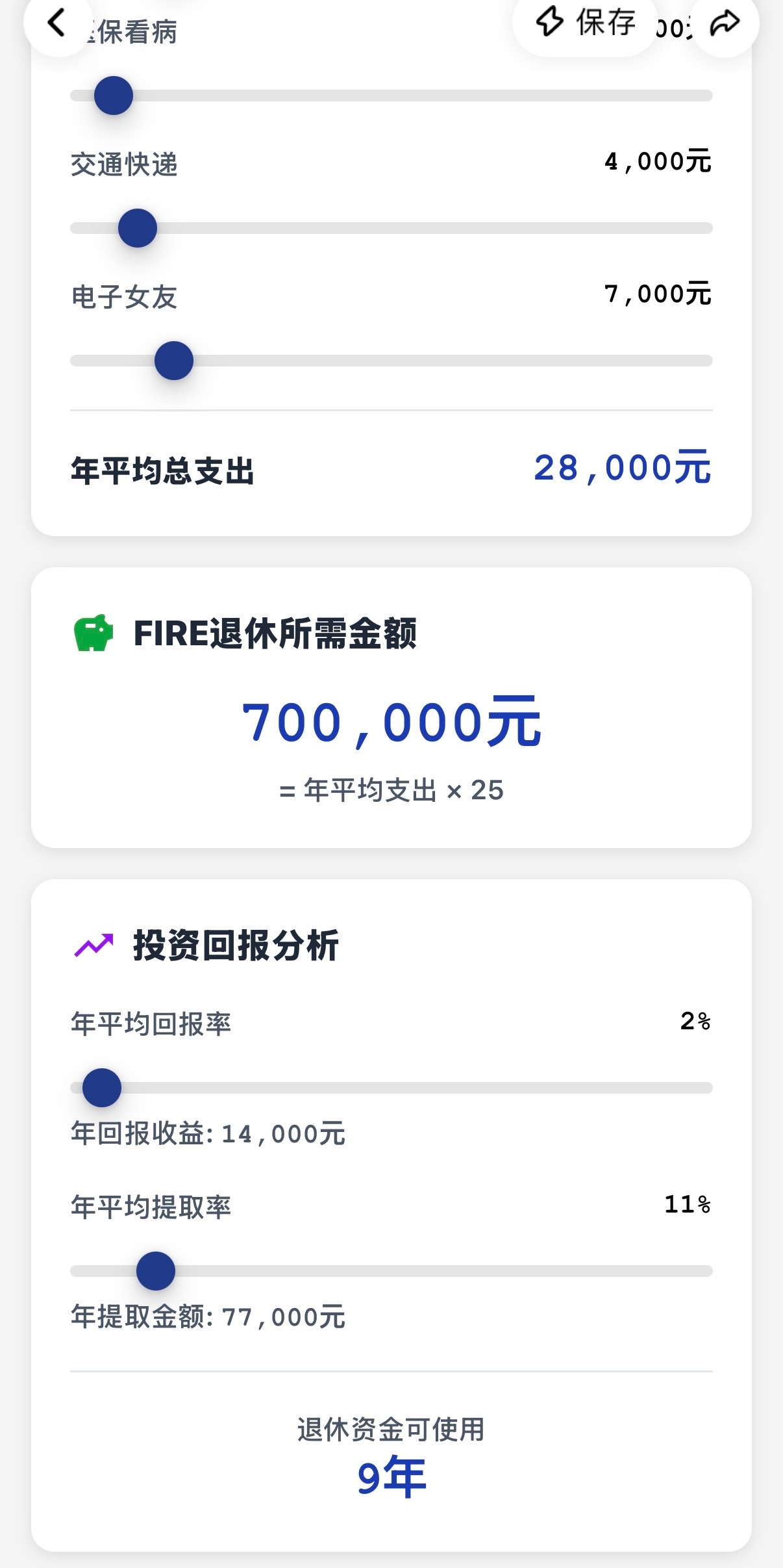 男子存100万退休3年后剩105万原来这个退休计算器是用灵光做的,我也用灵光做了退休计算器,算了一笔账,发现提前退休好像没那么遥不可及!我平时在小城市生活,吃饭自己做一个月1000足够,再加上交通、日用、偶尔买件衣服,一年算下来开销大概3万5。按4%的理财收益算,理论上100万存款就能覆盖日常开销。不过说实话,100万对普通打工人真不是小数目,我工作20年才攒下100万。其实我不是鼓吹大家立刻辞职躺平,而是提醒我们要清楚自己的收支情况,做好财务规划。比如十多年前我给自己定了目标:先存够50万再考虑半退休状态,同时还要持续学习理财知识,让钱生钱。毕竟退休不是终点,而是另一种生活方式的起点,没有规划的"退休"可能变成焦虑的开始。建议大家也动手算算自己的"退休成本",找到适合自己的节奏,慢慢向理想生活靠近潘明观点