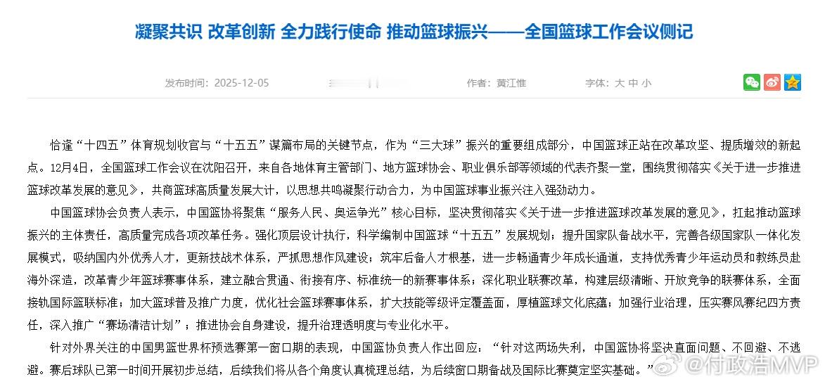 中国篮协主席郭振明在全国篮球工作会议期间回应了男篮世预赛中国男篮对阵韩国两连败 ,表示直面问题、不回避、不逃避。针对外界关注的中国男篮世界杯预选赛第一窗口期的表现,中国篮协负责人作出回应:“针对这两场失利,中国篮协将坚决直面问题、不回避、不逃避。赛后球队已第一时间开展初步总结,后续我们将从各个角度认真梳理总结,为后续窗口期备战及国际比赛奠定坚实基础。”具体内容详见今天出版的《中国体育报》第三版的《凝聚共识 改革创新 全力践行使命 推动篮球振兴——全国篮球工作会议侧记》一文,作者:黄江惟,总局官网也予以全文刊登。