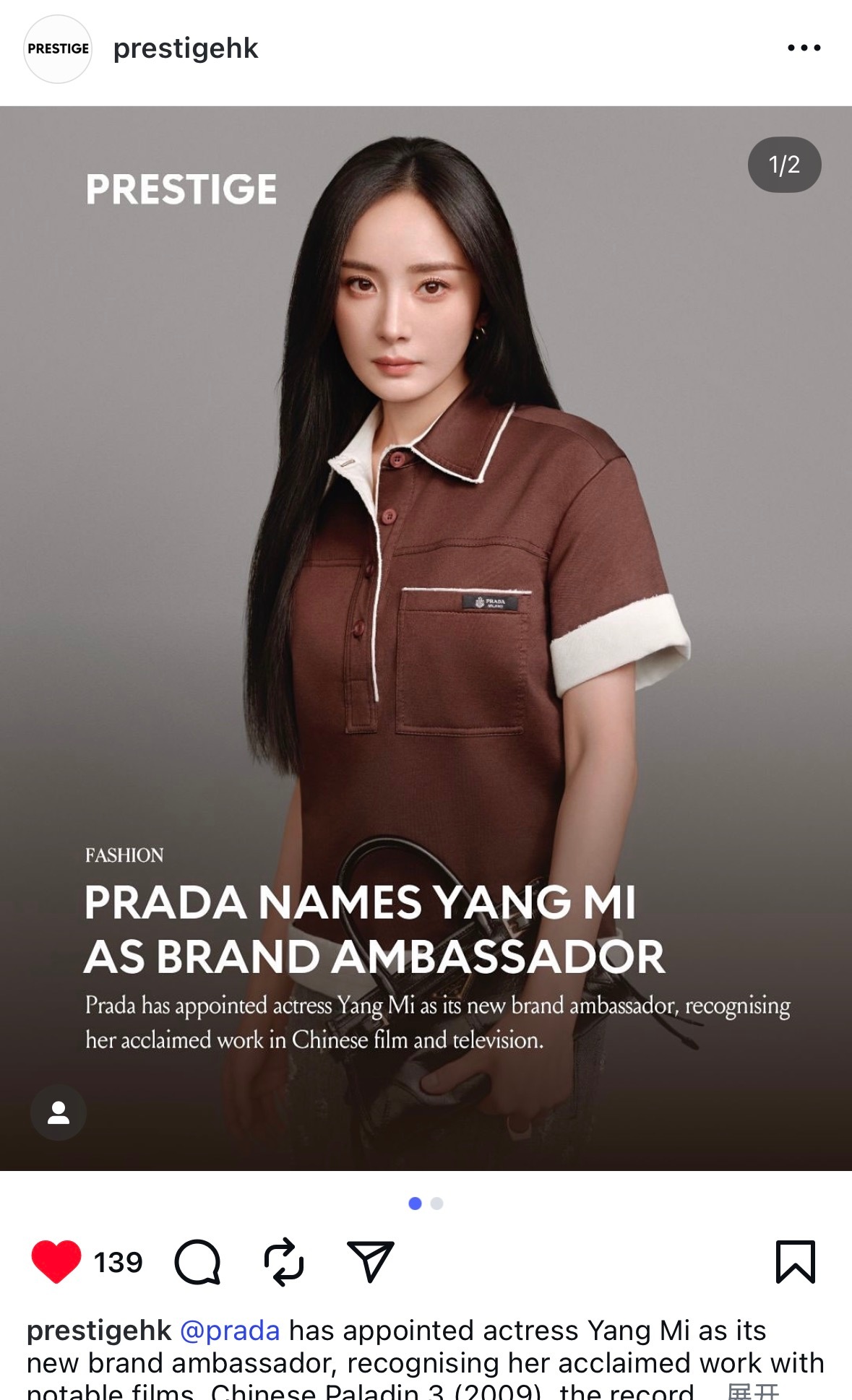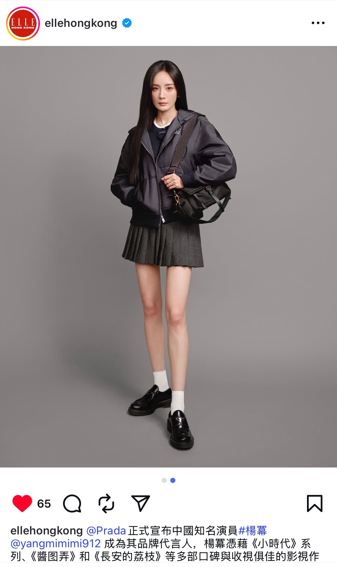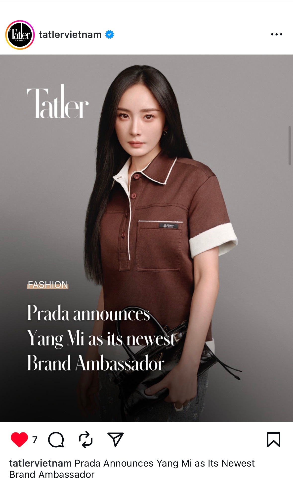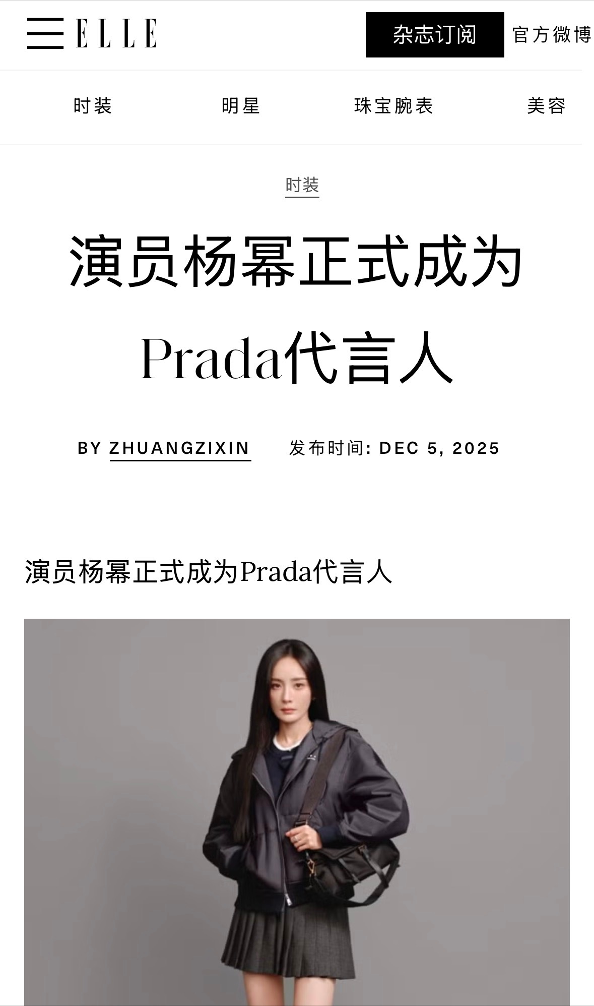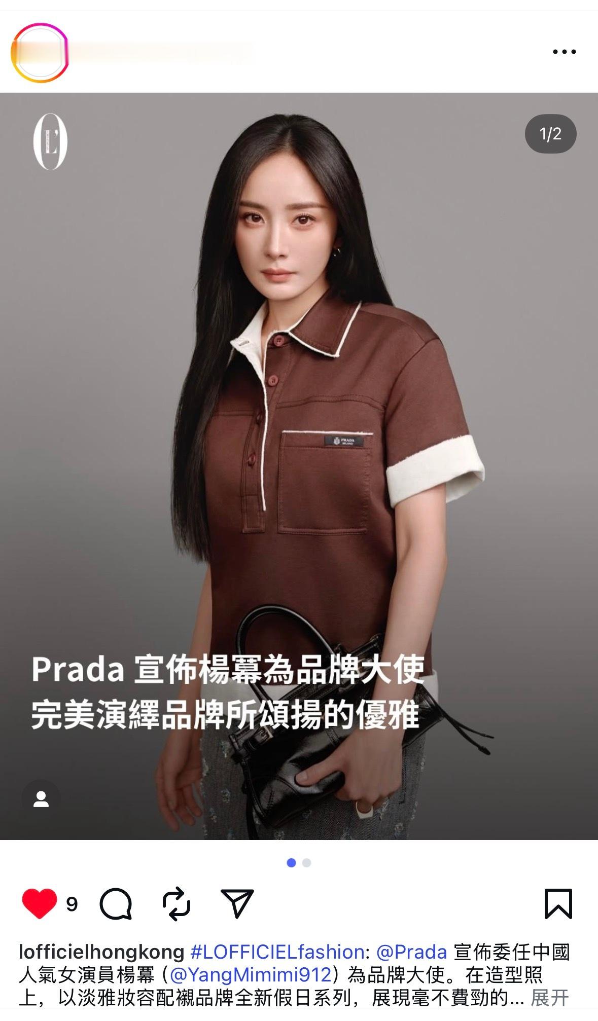 Prada官宣杨幂 lofficielmy、ellehongkong、lofficielhongkong、prestigehk、tatlervietnam、ELLEChina 多个时尚杂志在海外社交平台上报道杨幂成为Prada品牌代言人的消息,杨幂完美演绎品牌所弘扬的优雅!👏杨幂Prada品牌代言人