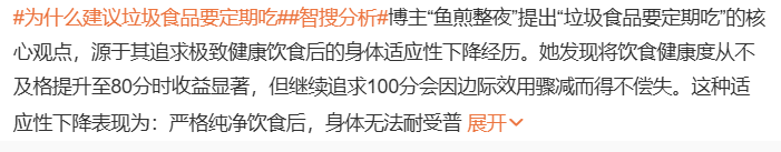 热搜话题里,一位健康博主表示,追求极致的纯净饮食,反而会让身体丧失适应力。他亲身体验显示,长期严格控糖、使用单一健康油品和限蛋白饮食后,身体指标达到"满分状态",但偶然食用外卖零食即出现便秘、爆痘等不耐受反应。这本质上是健康饮食的边际效用递减现象——当健康水平从80分追求100分时,需付出巨大精力却收益甚微,而从不及格提升到80分的健康收益则最为显著。