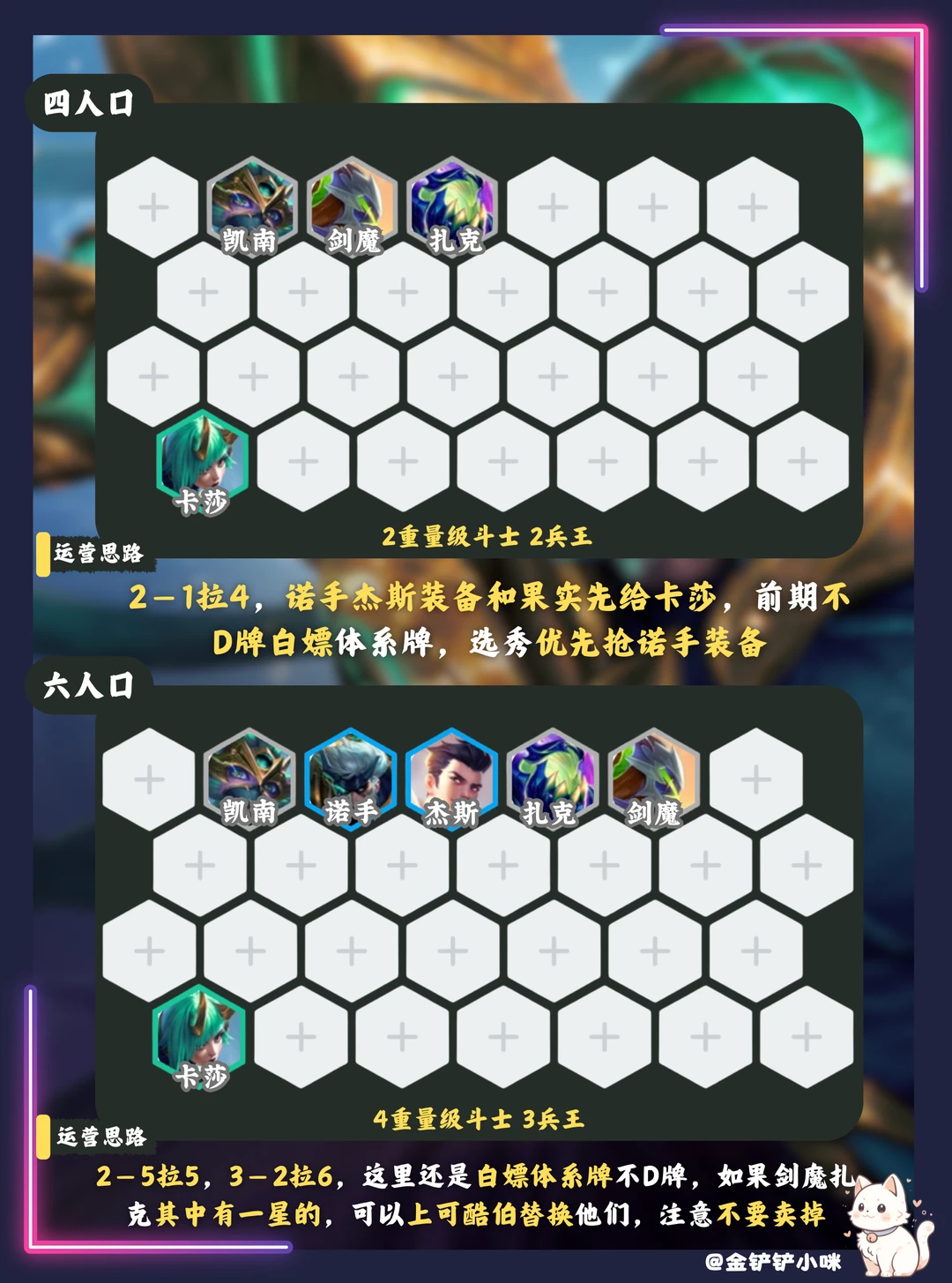 2️⃣阶段2-1拉4,2-5拉5,前期不D牌白嫖体系牌,诺手装备果实先给卡莎,选秀优先抢诺手装备