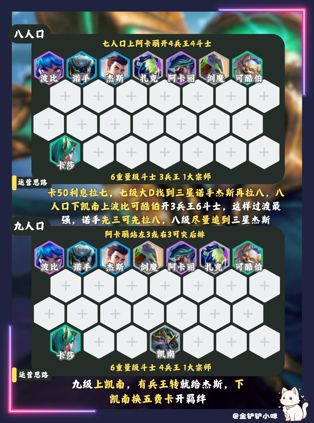 3️⃣阶段3-2拉6,卡50利息拉七,七级大D找到三星诺手杰斯再拉八,诺手先三可先拉八,注意七级开4斗士4兵王