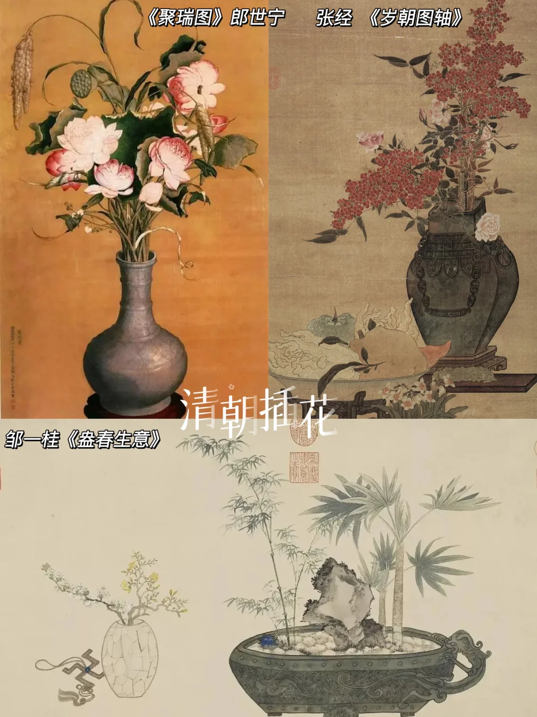 此外,将海棠、梅、莲、桃、杏花作为主角,搭配松、柳、柏或南天竹,同时将花高与瓶高控制在5:8或8:5的黄金比例,形成三角或发散式构图的写景花,仿若将自然景观移植屋内,一时风靡宫廷。