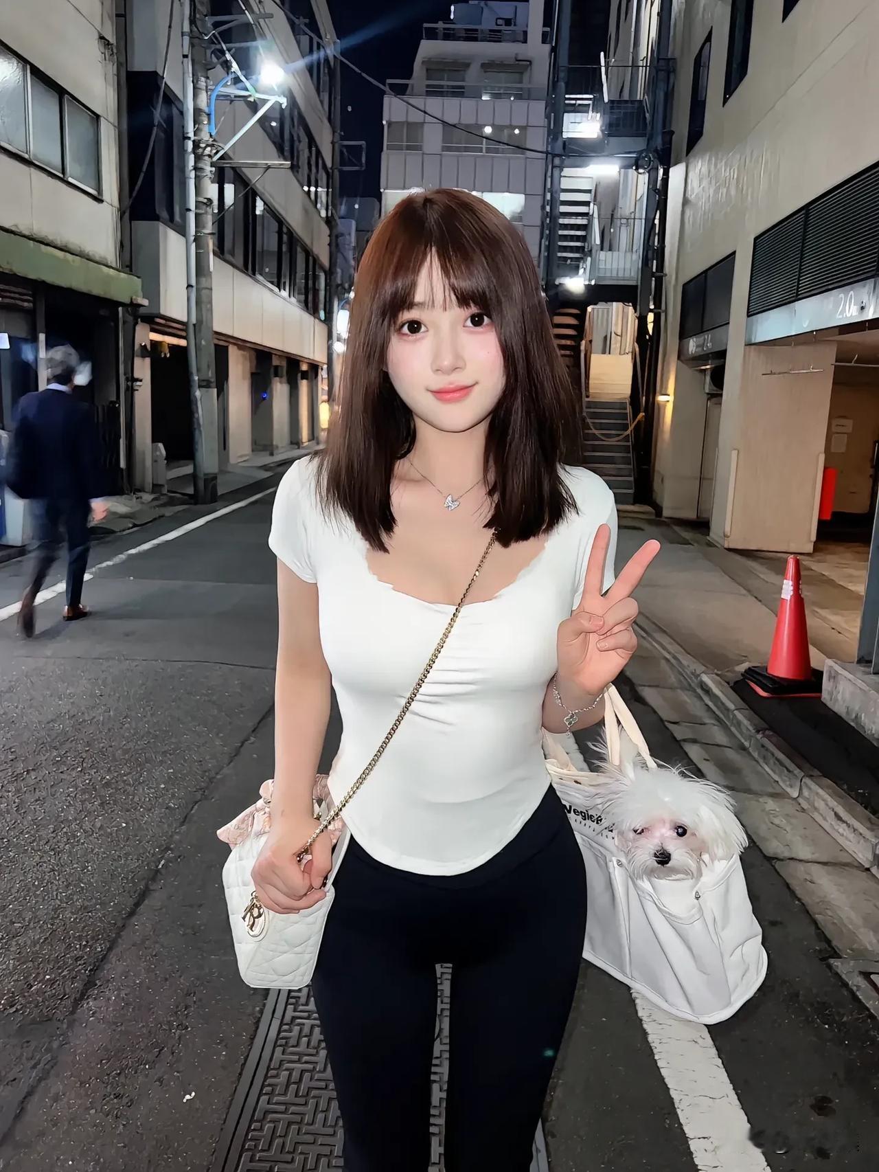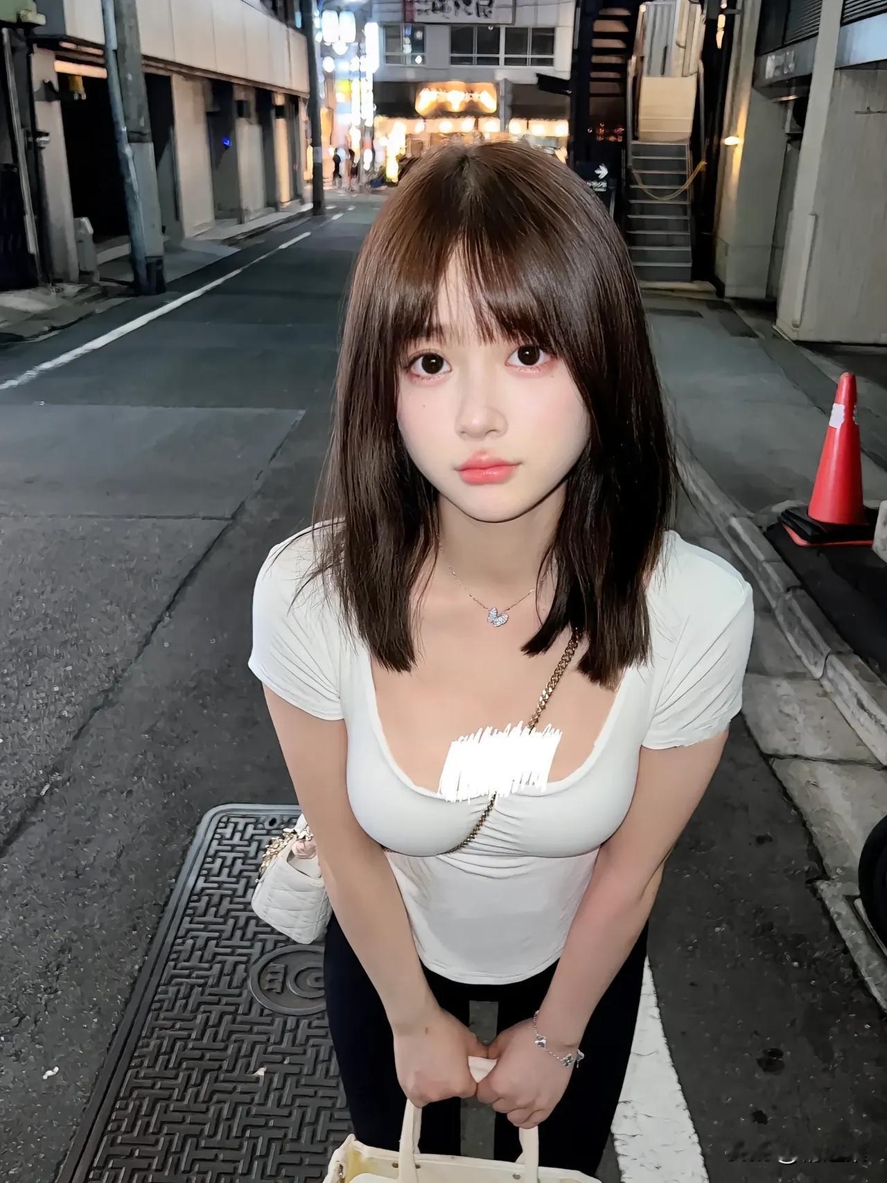 夜晚街头的甜美少女,白色上衣与黑色裤子搭配,手拿包包,气质出众。