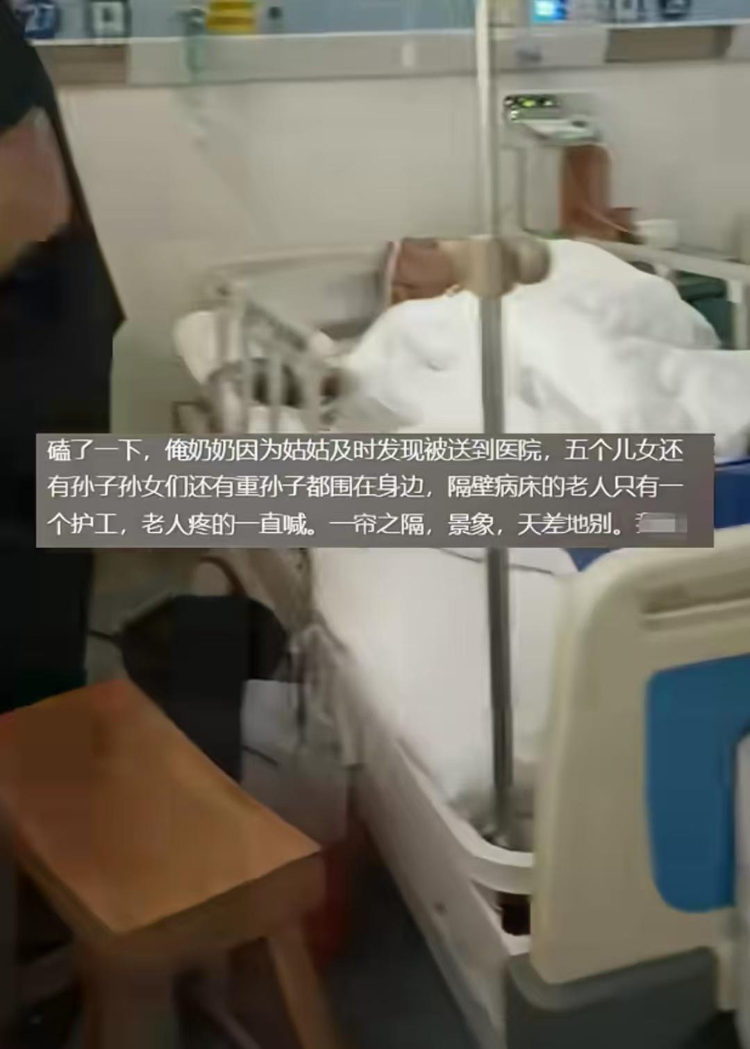 山东,一病房内却是两种不同处境,两老人同样都是脑血栓患者,一个子女和孙子都在身边,另一个却只有护工照顾,老人一直喊疼,护工却在旁边玩手机,真的是天差地别。有网友评论,有没有可能喊疼的那位老人的家人正在努力挣药费?不要动不动就道德绑架别人。其实也有一种可能是孤寡老人,可以遇见选择不结婚的人的一种结局。