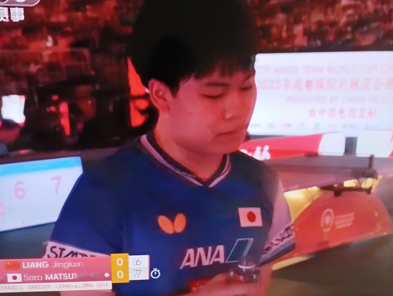 孙颖莎在场上为梁靖崑热情加油[赞]! 梁靖崑1-7落后,追到了6-7! 对手松岛辉空叫了暂停! 这是2025成都国际乒联混团世界杯第二阶段循环赛,中国队对阵日本队的第三盘第一局比赛! 梁靖崑连得7分,比分来到了8-8! 但这会儿梁靖崑9-11输了第一局! 目前大比分中国队5-2领先! 大胖继续加油[奋斗]!