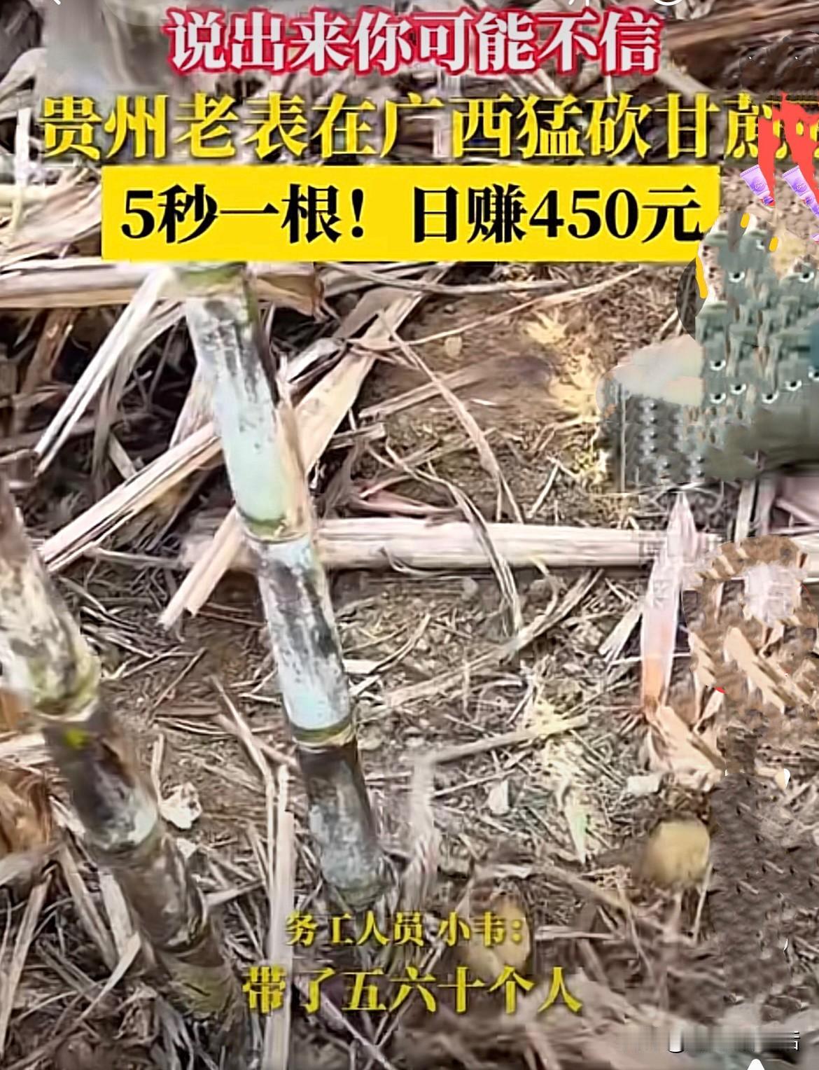 广西砍甘蔗日赚450?贵州老表5秒一根,真相到底咋回事? 广西甘蔗收割季太热闹了! 大批贵州老表坐着大巴专车往广西跑,就为了去砍甘蔗挣钱过年。网上说他们5秒砍一根,一天能赚450元,这消息一出来,网友直接吵翻了! 有人说纯属吹牛:砍甘蔗看着简单,除蔗叶、修根才费时间,5秒一根根本不现实,纯属博眼球。但也有知情人爆料,现在广西好多蔗农专门包大巴接贵州工人,包吃包住还包车费,就盼着有人来助力收割。 其实内行人都懂,砍甘蔗是实打实的体力活,天不亮就下地,天黑才收工,一天下来腰酸背痛。说日赚450的,估计是手脚特别麻利、每天干满十几个小时的狠人;大多数人一天150-200元才是常态,一个榨季3个月左右,能挣两三万回家过年就不错了。 有没有广西或者贵州的朋友? 你们身边有人去砍甘蔗吗? 实际一天能赚多少? 来评论区说说真相!