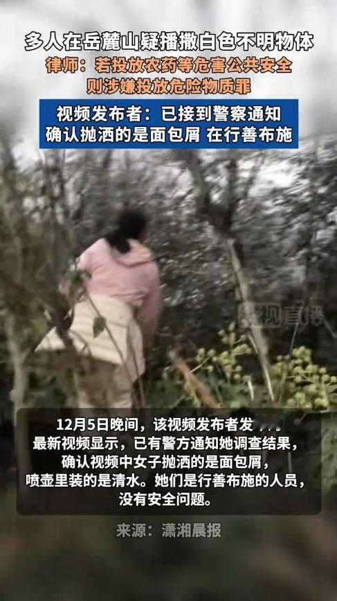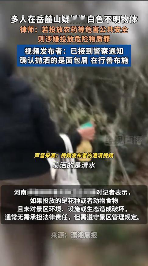 “严查到底!”12月4日,湖南长沙,一女子在景区游玩时,看到前方有一群男女,一边挥舞着旗子,一边往草丛撒白色不明物体,女子觉得这些人的行为很可疑,就把视频发到了网上,很快引起当地警方的注意。网友:小心外来物种! 现在很多人为了积善行德,会放生一些小动物,或者救助流浪动物,这原本是一件好事,可是放生前一定要做好准备工作,别把外来物种传播到外面。 事发当天,女子在景区里游玩,周围人来人往的好不热闹,就在她穿越人群时,却看到不远处有一群人非常可疑。 只见这伙人不断朝一旁的草丛撒着什么东西,还有人用喷壶喷不明液体。由于对方人数众多,女子知道直接上前制止容易吃亏,就将视频发到了网上。 网友们看后也是议论纷纷,有人怀疑是在播散外国的植物种子,故意造成生物入侵,也有人猜测是在消毒,防止病毒、细菌的扩散。 这件事很快就引起了当地警方的关注,经过详细的调查,最终发现这群人是在行善布施,他们挥洒的只是面包屑和馒头屑,而喷洒的也只是清水。 不过景区也做出回应,这样的行为是绝对禁止的,会导致景区内出现老鼠、蟑螂等,不利于游客的健康。 想做善事的出发点是好的,但是也要讲究方式方法,不能仅凭个人爱好,就擅自投喂、放生,这一点大家一定要牢记! 信息来源:《有人向路边撒白色不明物体 岳麓山景区回应:没有造成环境污染 是游客在撒面包屑和馒头片》红星新闻