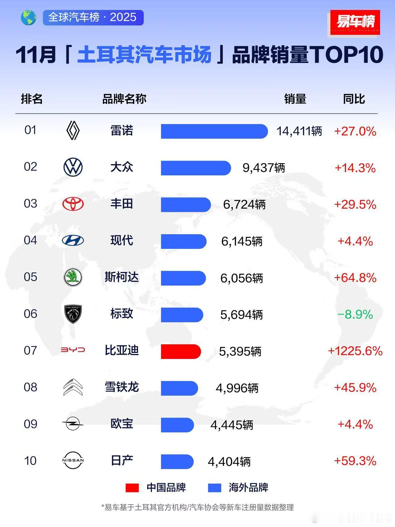 比亚迪在土耳其11月达到全品牌第七名,达到5395辆,销量继续回升向上!!巴西销量也很亮眼,也是排名第七,销量9726辆,明年开始巴西1万就是一个保底的销量,真的海外市场强势突围了,爆发起来也就1-2年时间