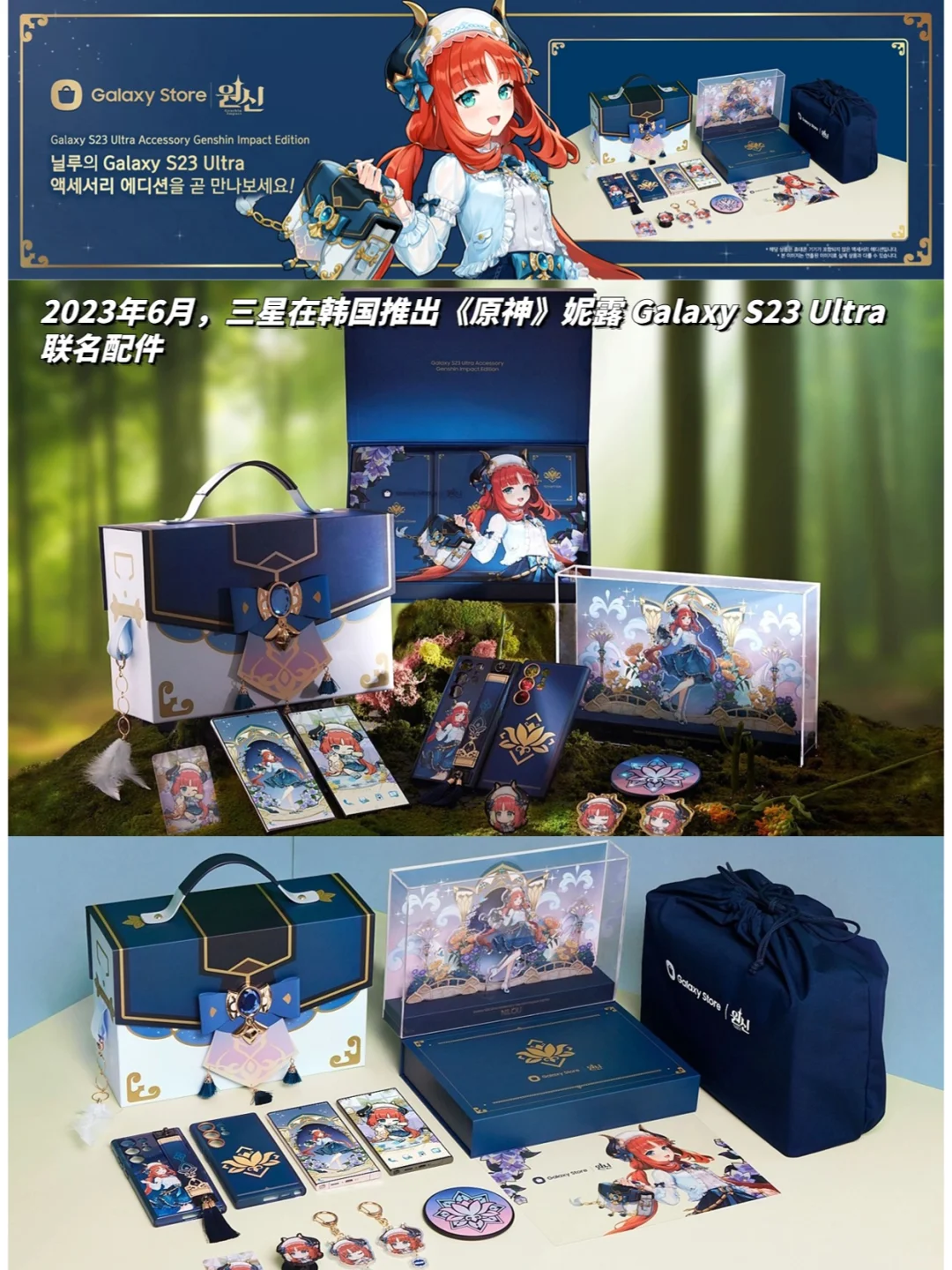 图一从海报看,三星S24系列这次与“银狼”联名的套装包括多款主题手机壳、一条手机绳,一个人物立牌,但大概率只限于韩国。而去年和妮露的联名配件则包括妮露主题手提包、两个手机壳、Smart Talk 对讲套件、妮露亚克力相框、无线充电器、两种亚克力钥匙扣,还有系统主题、Bixby 妮露语音以及游戏内福利兑换码。