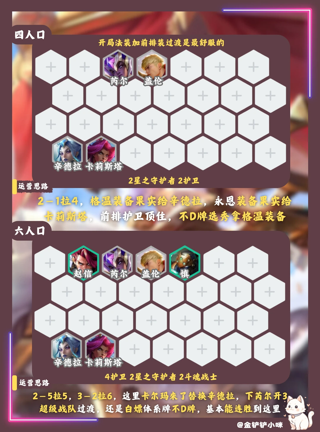 🔴浅谈:这套阵容比较贵所以经济海克斯可以拿两个,经主播昨天试验,辛德拉卡莉斯塔搭配护卫阵容过渡是最舒服的,每把前期都能连胜到三阶段甚至四阶段,成型基本吃鸡
