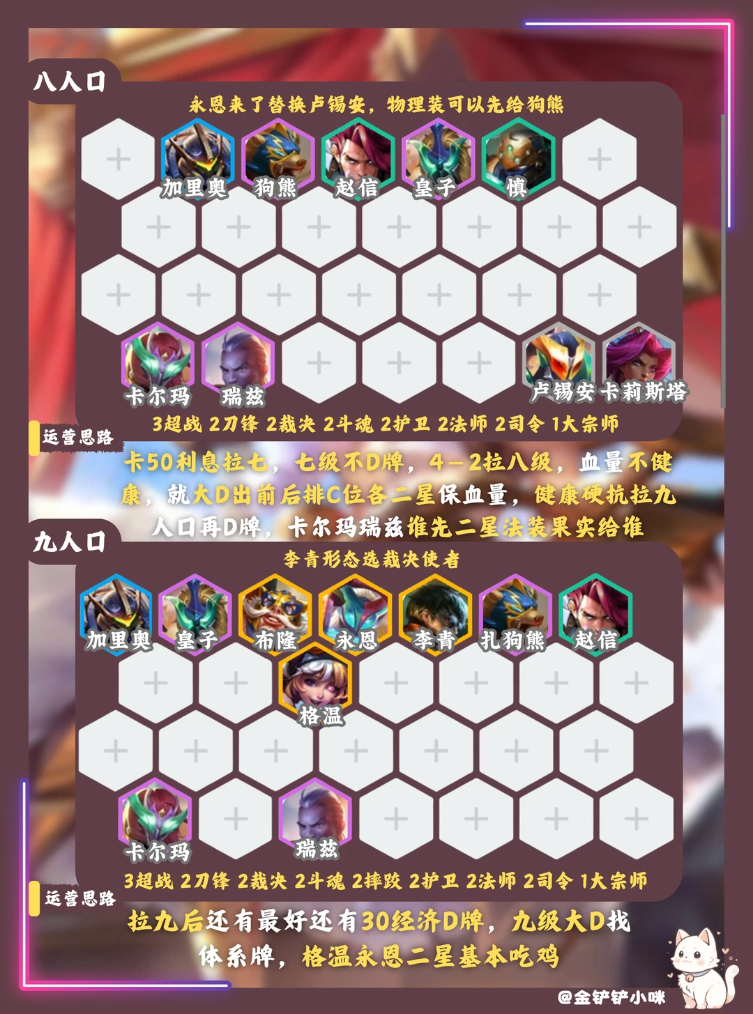 4️⃣阶段4-2拉8,血量不健康小D找到二星卡尔玛或者瑞兹加任意前排,血量健康可硬抗拉九,注意别把经济拉崩