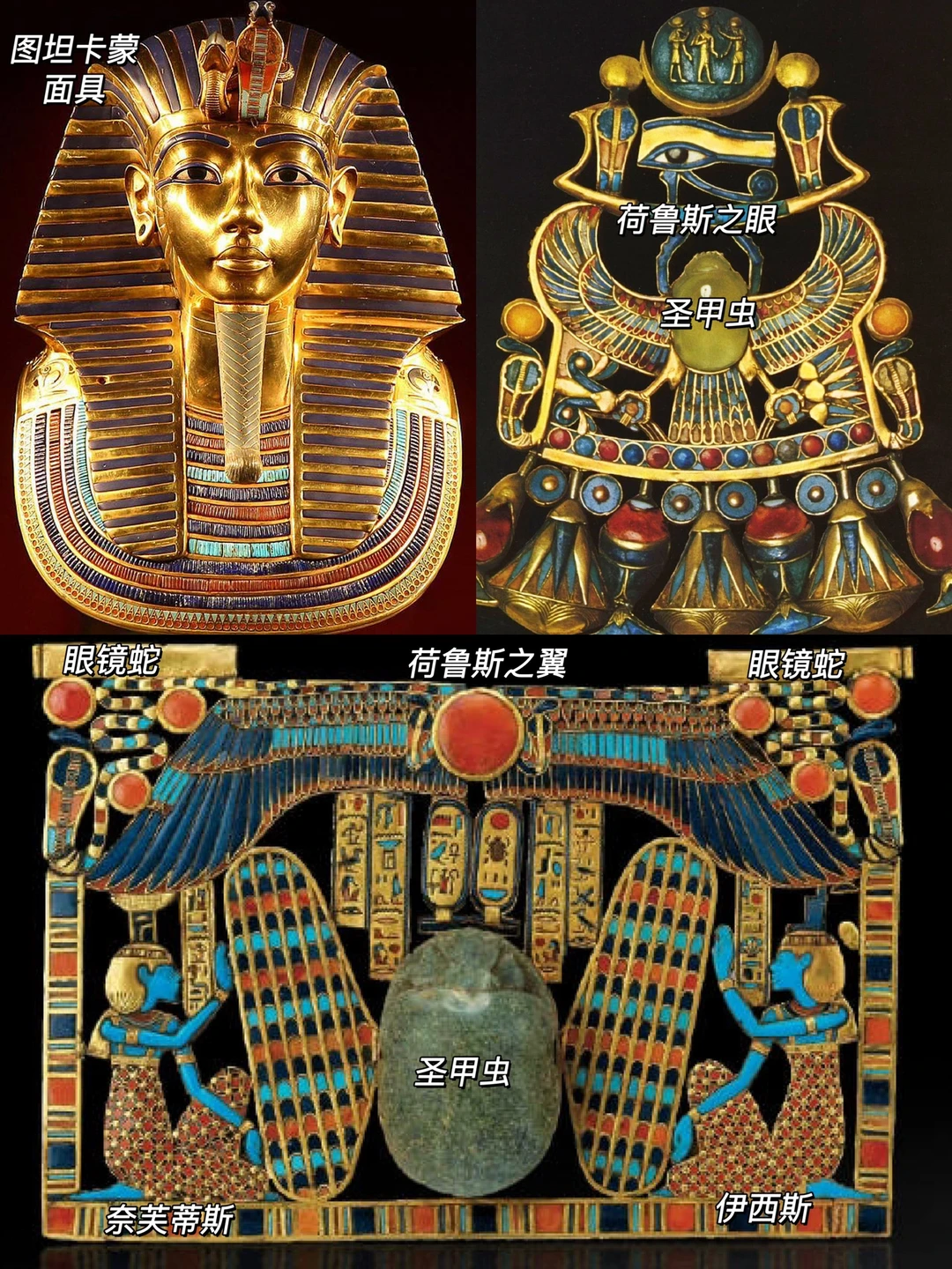 🫅但墓内最值得关注的,还是逝者的装饰艺术。就拿图坦卡蒙来说吧,他的面部覆盖着黄金面具,胸前甲衣由圣甲虫、奈芙蒂斯、伊西斯、太阳、荷鲁斯双翼及眼镜蛇构成,材料则选用了金子、红玉、绿松石和各色玻璃。