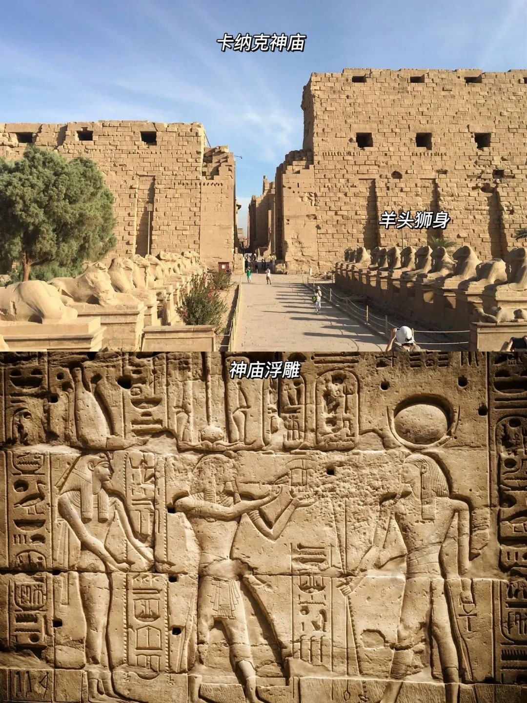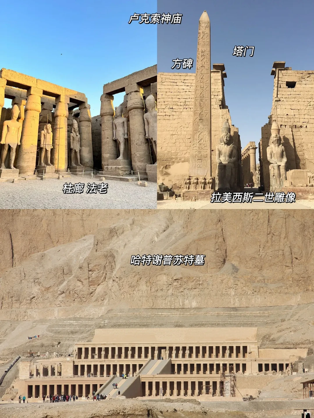 🔸隔着尼罗河的帝王谷对面,是卢克索神庙和卡纳克神庙。在那里,我们能看到塔门、塑像、方尖碑、柱廊/狮身羊头大道、内院等建筑构造。一切都高耸入天,巨大无比。