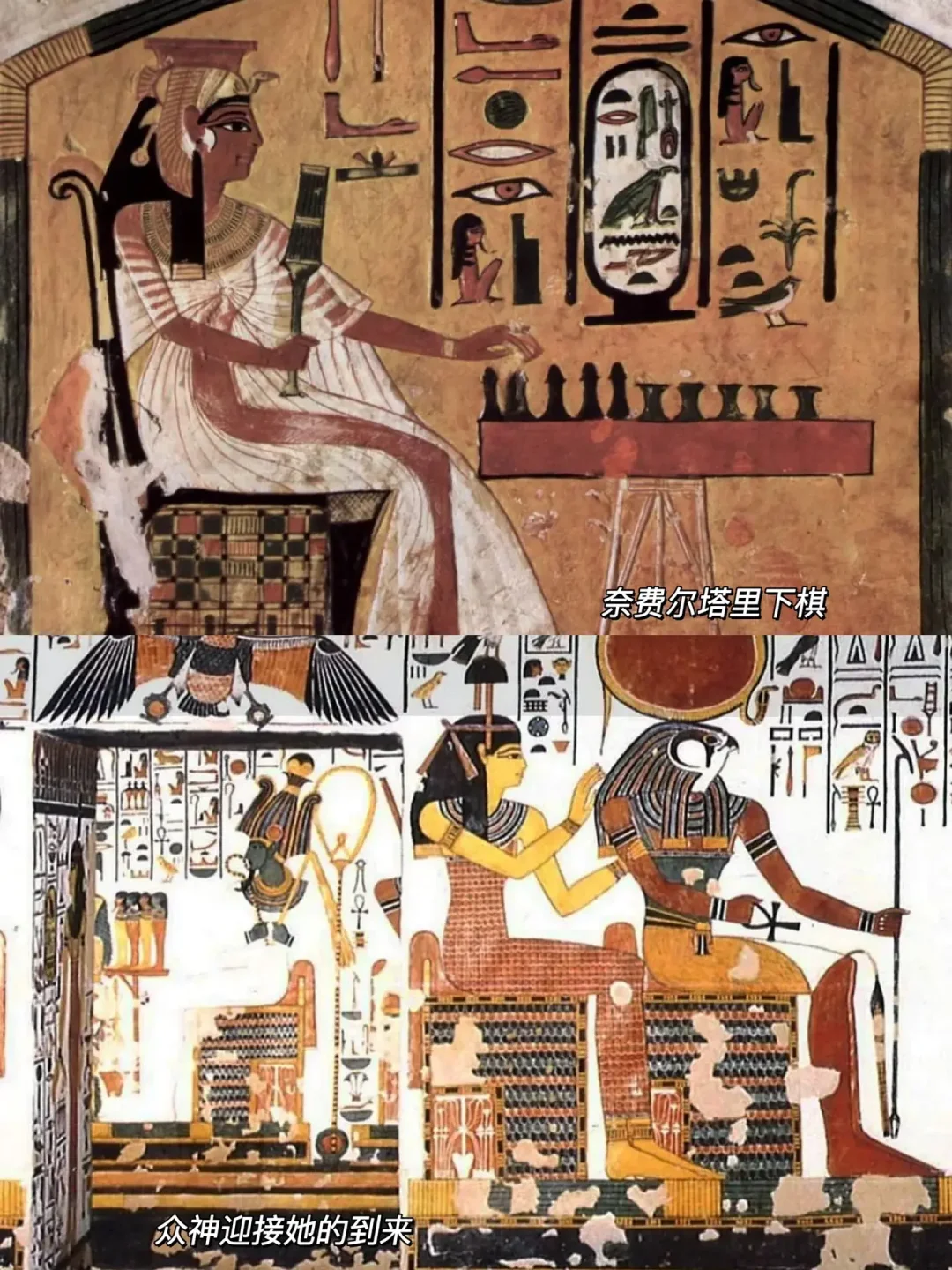 🎨如果进入墓室,通常会看见壁画。拉美西斯二世为妻子建造的坟墓,墙壁上描绘了王后经由神袛们允许进入地下世界,通过下棋打败对手等场景。