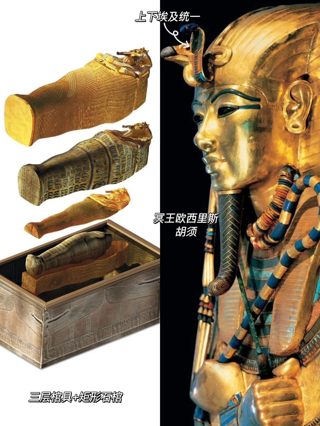 🫅接着他被放进三层叠加的木乃伊形棺木中,每一层都有精心的雕刻、绘画和镀金。最外层他的胡须象征着冥王欧西里斯,头上的秃鹰和眼镜蛇代表了上、下埃及,眼睛、眉毛、和身体则由青金石和各种宝石装点。