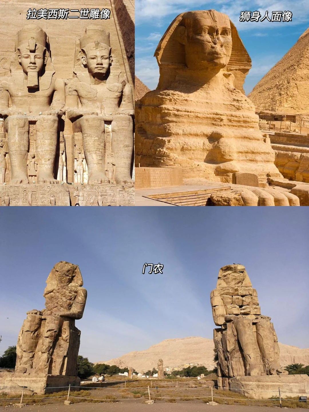 🗿当然,建筑少不了雕塑装饰,比如金字塔前的狮身人面像、阿蒙霍特普三世墓(已毁)前的门农巨像、阿布辛贝神庙前的拉美西斯二世雕像,他们代表着王权与重生,矗立于此,历经千年。