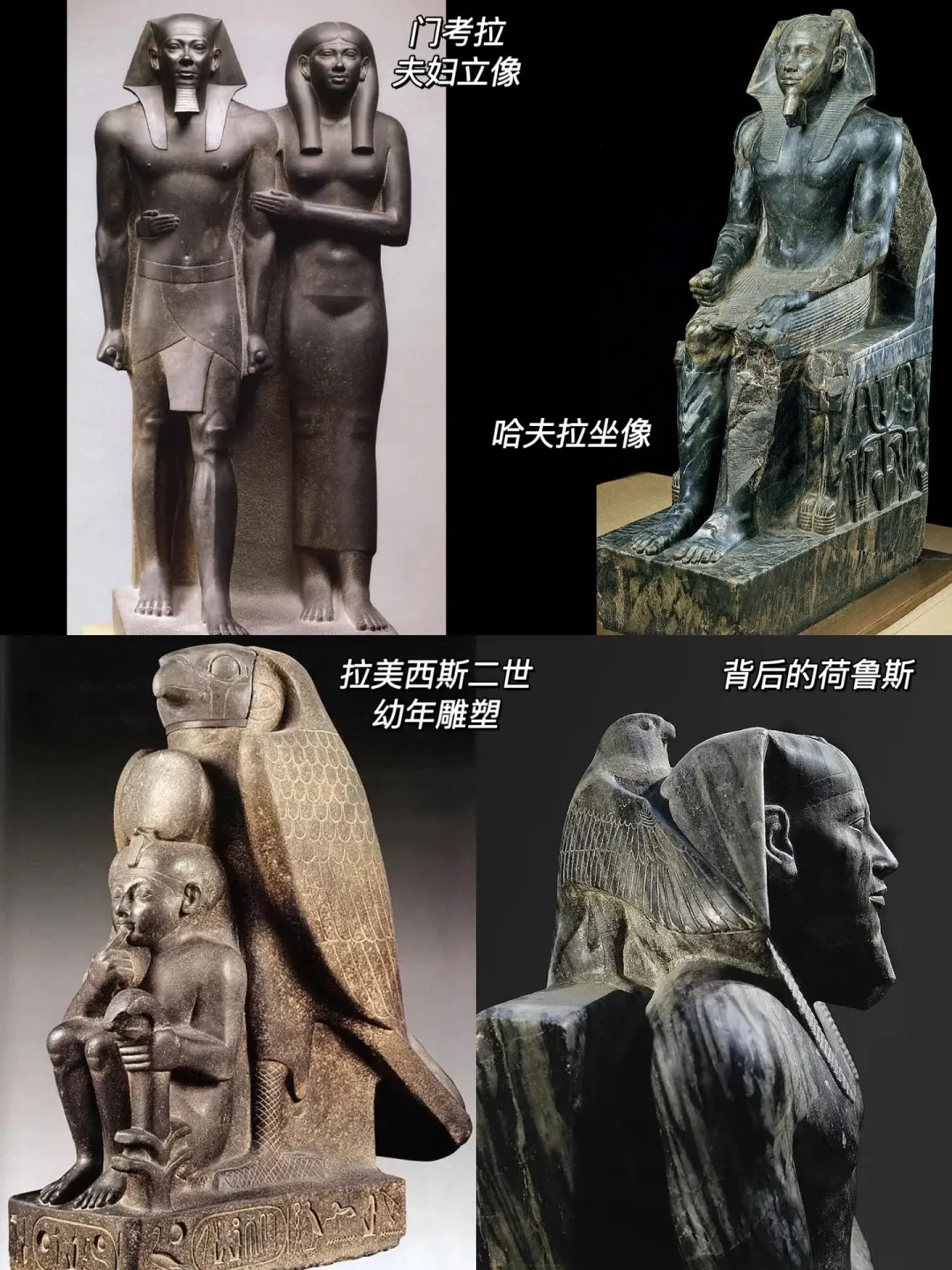 🗿皇家祭祀中,法老雕像由花岗岩制成,安放在金字塔和神庙中。以朴素流畅示人的门考拉夫妇立像,以细腻完整著称的哈夫拉及其肩头的法老守护神荷鲁斯,以圆润灵巧突出的拉美西斯二世幼年雕塑,都是现存于开罗国家博物馆的杰出作品。