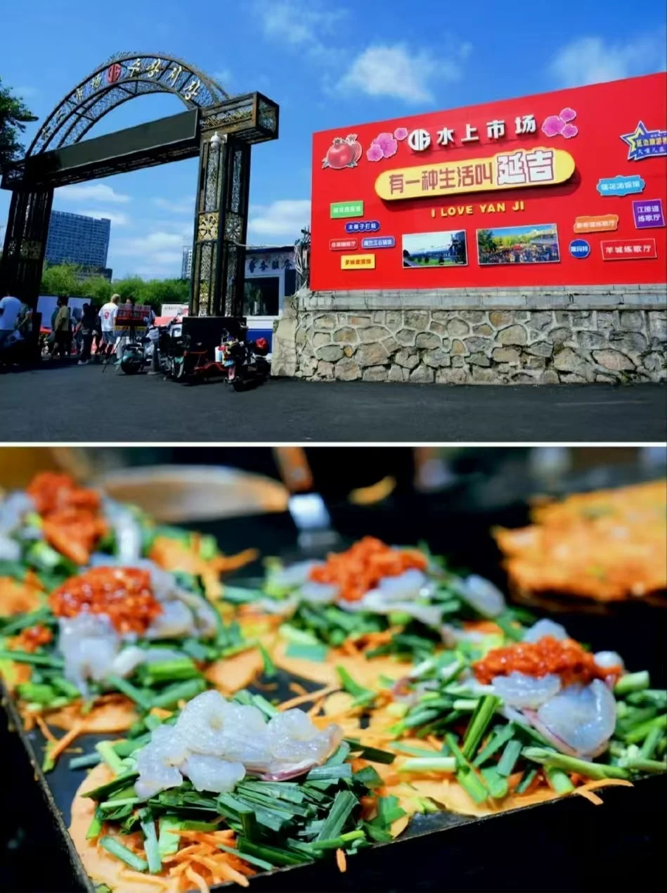 清晨体验朝鲜族风情,从水上市场开始!「人参鸡汤」必点,整只鸡塞满糯米,汤底清甜回甘,喝完瞬间元气满格~虾饼外酥里嫩;血肠糯叽叽!别忘了买盒便宜到哭的水果(蓝莓樱桃,绝对不会让你空手而归),边逛边吃超治愈~市场里还有人参、米酒试喝,阿姨们超热情!