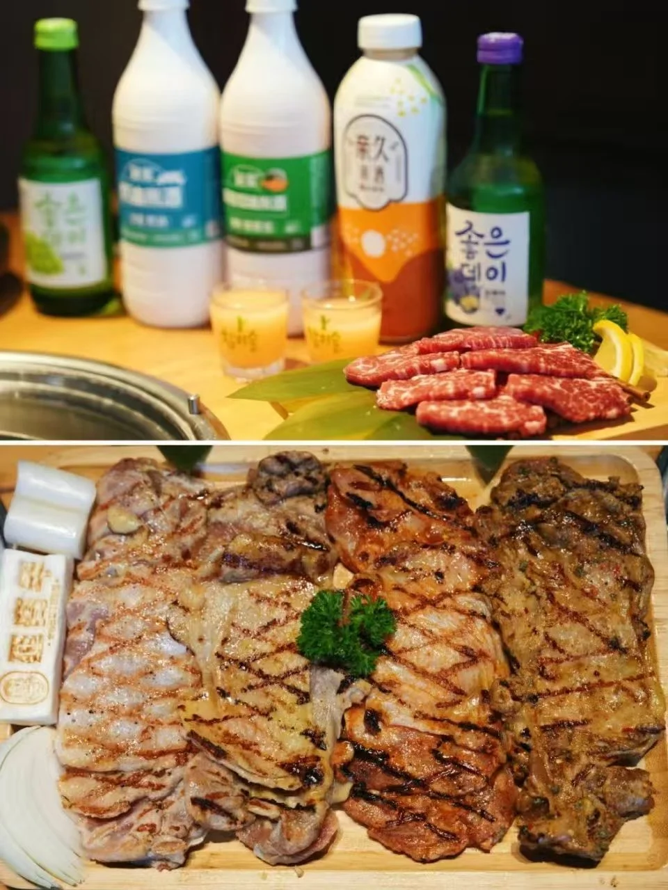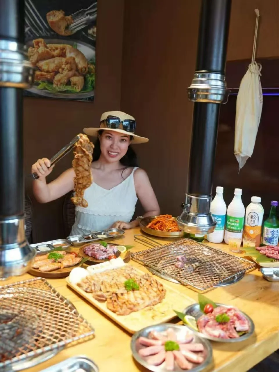 一天的压轴是炭烤专门店!炭烤出的鸡肉外焦里嫩,蘸特调酱料一口爆汁~推荐「鸡腿排」和「腊肠」,配冰镇米酒绝了!店员还会帮忙烤,懒人福音~