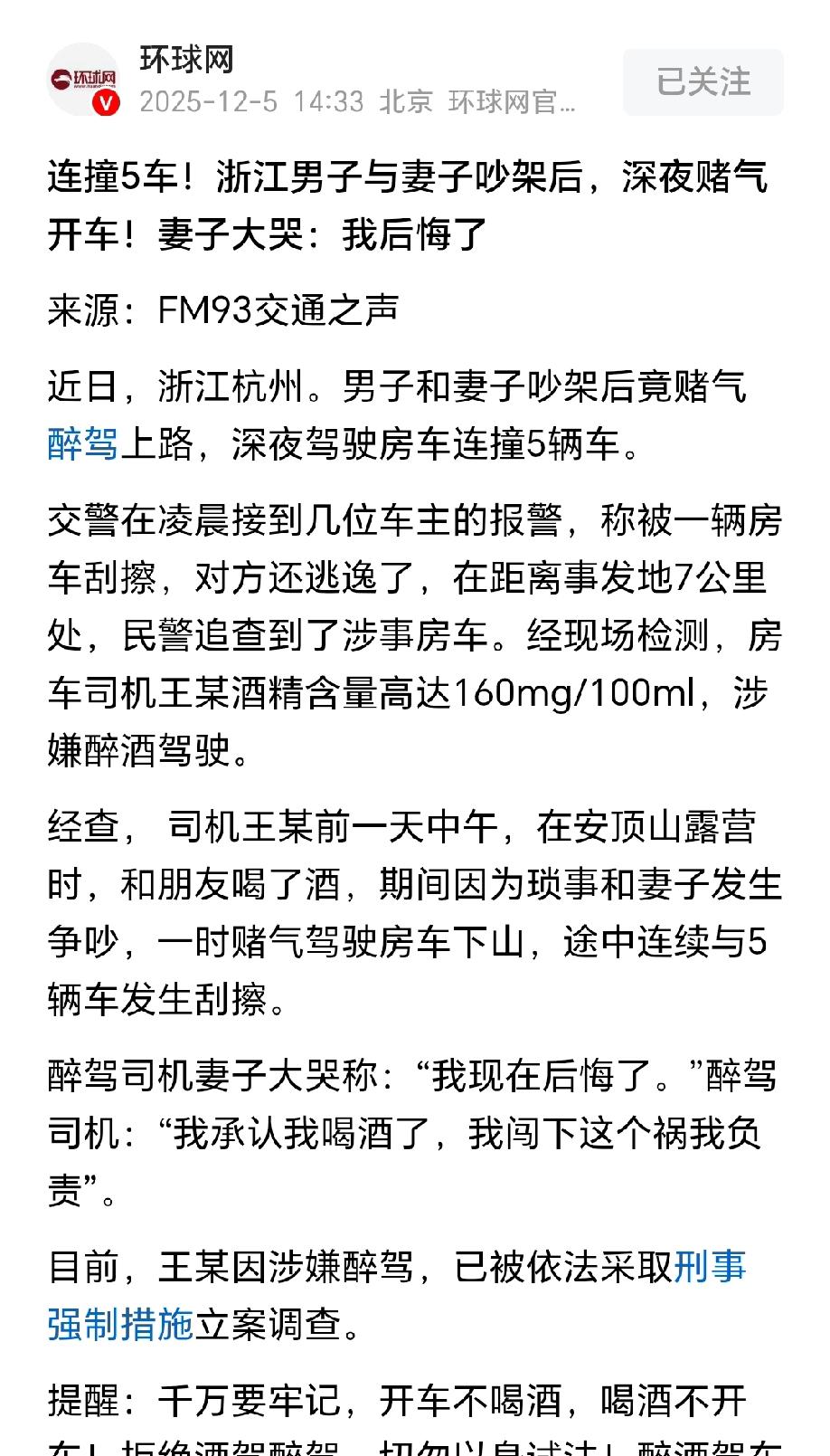 玩大了!浙江杭州,男子和妻子、朋友一起外出露营游玩,吃饭喝酒期间,妻子丝毫不给男子面子,当着朋友的面数落他,两人为此争吵不休。男子受不了妻子的烦人,深夜驾驶房车赌气,一连撞了5辆车。被公安机关拦下后,检测其体内酒精含量160mg/100ml,涉嫌醉酒驾驶被刑拘。事发后,妻子大哭:我后悔了,不该和你赌气的。男子却大不一样,果断承认这一切都是他做的,完全不后悔。 妻贤夫祸少,男子王某对此深有体会,原本好好的一场露营,本是好友相聚、夫妻散心的好机会,没成想一顿饭的功夫,竟闹成了刑事案件。 事发当天,王某带着妻子,约上几位朋友一同去安顶山露营,白天赏着风景聊得尽兴,到了饭点大家围坐在一起吃饭喝酒,氛围本该热热闹闹的。 可饭桌上,王某的妻子不知因啥琐事,对着他没停地数落,一点情面都没留,当着所有朋友的面翻旧账、说他的不是,言语里满是不满。 周围朋友看着这情形都没法插话,只能尴尬圆场,可王某妻子压根没停的意思,越说越激动。 王某坐在一旁,脸上挂不住,心里又气又躁,觉得在朋友面前丢尽了脸,起初还忍着没反驳,可妻子越说越过分,他再也忍不住,当场就跟妻子吵了起来。 两人你一言我一语,吵得不可开交,好好的聚餐彻底被搅黄,朋友劝了半天也没拦住,最后闹得彼此都满心火气,不欢而散。 夜里气温渐凉,王某心里的火气却一点没消,满脑子都是饭桌上妻子数落自己的模样,越想越觉得憋屈,只觉得妻子太不讲理,这口气实在咽不下去,一股赌气劲涌上心头。 他完全忘了自己喝了酒的事实,脑子一热就拿起房车钥匙,没跟任何人打招呼,径直坐进驾驶座,发动车子就往山下开,只想靠着开车发泄心里的怒气。 酒精让王某的反应也慢了大半,加上夜里视线差,心里憋着气,他握着方向盘一路往前冲,根本没把控好车速和方向。 行驶途中,车子突然撞上了路边停放的一辆私家车,可怒火上头的他根本没停,踩着油门继续往前,短短几公里路程,接连又和4辆车子发生刮擦。 被撞车主们听见动静出来查看时,王某已经开着房车逃远了,大家见状赶紧拿出手机报警。 交警接到报警后立刻出动,根据车主们提供的线索一路追查,最终在距离事发地7公里的地方,成功拦下了王某的房车。 民警上前检查时,很明显闻到王某身上飘来的浓烈酒气,说话也含糊不清,眼神飘忽不定,一看就是喝多了。 随后民警当场对他进行酒精检测,结果让人吃惊,王某体内酒精含量高达160mg/100ml,远超醉驾标准,已经涉嫌醉酒驾驶。 面对民警的询问,王某倒是没回避,直白承认他喝了酒,也认了撞车逃逸的事,直言“我承认我喝酒了,我闯下这个祸我负责”,丝毫没有一点后悔的样子。 而他的妻子赶到现场后,看着被拦下的房车、围着的民警,还有丈夫被带走的模样,瞬间崩溃大哭的表示:我现在后悔了,真不该跟他赌气吵那么凶的。 然而,再多的后悔也没用,一切都已经无法挽回。 目前,王某因涉嫌醉酒驾驶,已经被公安机关依法采取刑事强制措施,相关案件还在进一步立案调查中。 原本只是夫妻间的一场口角,却因一时冲动醉驾肇事,不仅要赔偿所有被撞车辆的维修费用,还要承担刑事责任,实在得不偿失。 王某只是为了逃避妻子的争吵,竟然选择锒铛入狱,简直是太过冲动。 从法律角度而言,王某醉驾肇事行为构成危险驾驶罪。 根据相关司法解释规定:在道路上驾驶机动车,血液酒精含量达到80毫克/100毫升以上的,属于醉酒驾驶机动车,以危险驾驶罪定罪处罚。 依据《刑法》第一百三十三条规定:在道路上驾驶机动车,有下列情形之一的,处拘役,并处罚金:(二)醉酒驾驶机动车的。 王某在露营期间饮用大量白酒后,明知酒精会影响驾驶安全,仍因与妻子赌气故意驾驶房车在公共道路行驶,经检测其血液酒精含量高达160mg/100ml,远超80mg/100ml的醉驾认定标准,已满足危险驾驶罪的构成要件。 同时,王某醉驾过程中连续与5辆机动车发生刮擦,造成他人财产损失,且存在肇事后逃逸的情节,属于危险驾驶罪的从重处罚情形。 即便王某承认犯罪事实、自愿承担责任,也不影响其刑事责任的认定,仍需依法接受拘役并处罚金的刑事处罚。 不仅如此,王某还需要全额承担事故财产损失。 《机动车交通事故责任强制保险条例》第二十二条规定:有下列情形之一的,保险公司在机动车交通事故责任强制保险责任限额范围内垫付抢救费用,并有权向致害人追偿: (一)驾驶人未取得驾驶资格或者醉酒的;有前款所列情形之一,发生道路交通事故的,造成受害人的财产损失,保险公司不承担赔偿责任。 此次事故中,5辆被撞车辆的维修费用均属于受害人的财产损失,因王某系醉酒驾驶导致事故发生,其车辆投保的保险公司无需在交强险及商业险范围内承担财产损失赔偿责任,所有车辆维修费用需由王某全额自行承担。 王某因一时冲动的醉驾行为,最终害人害己,得不偿失。