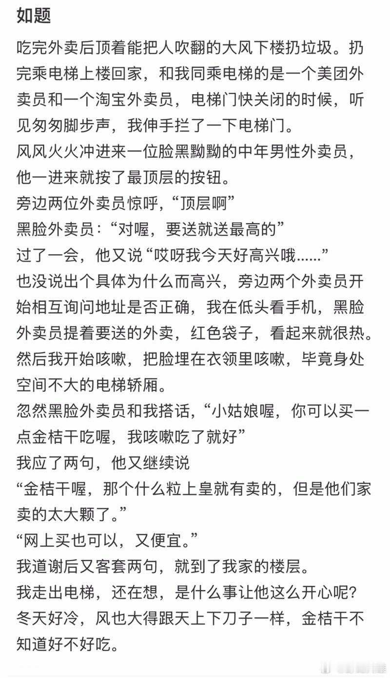 超级冷的冬天,和一群外卖员一起挤电梯…