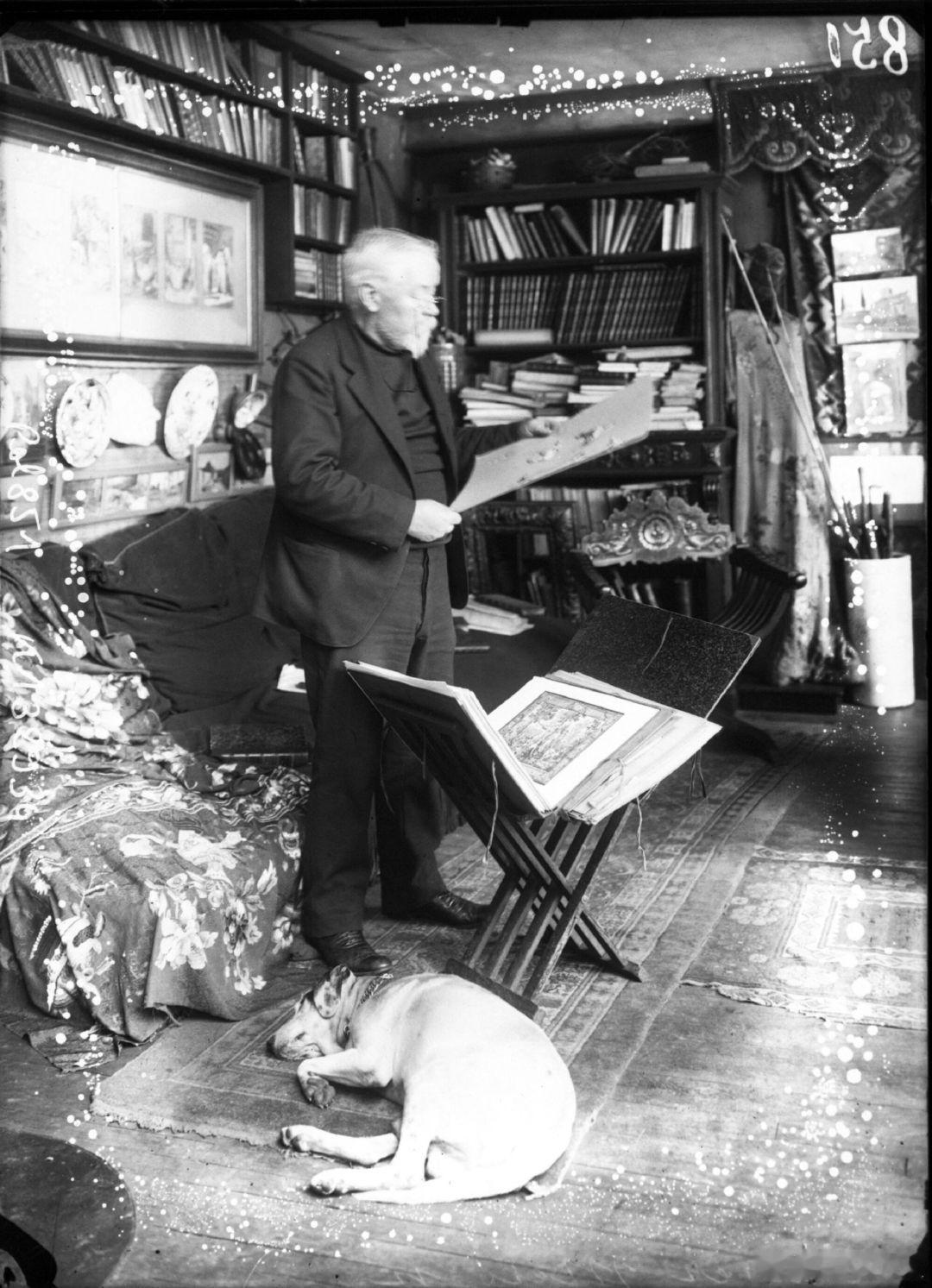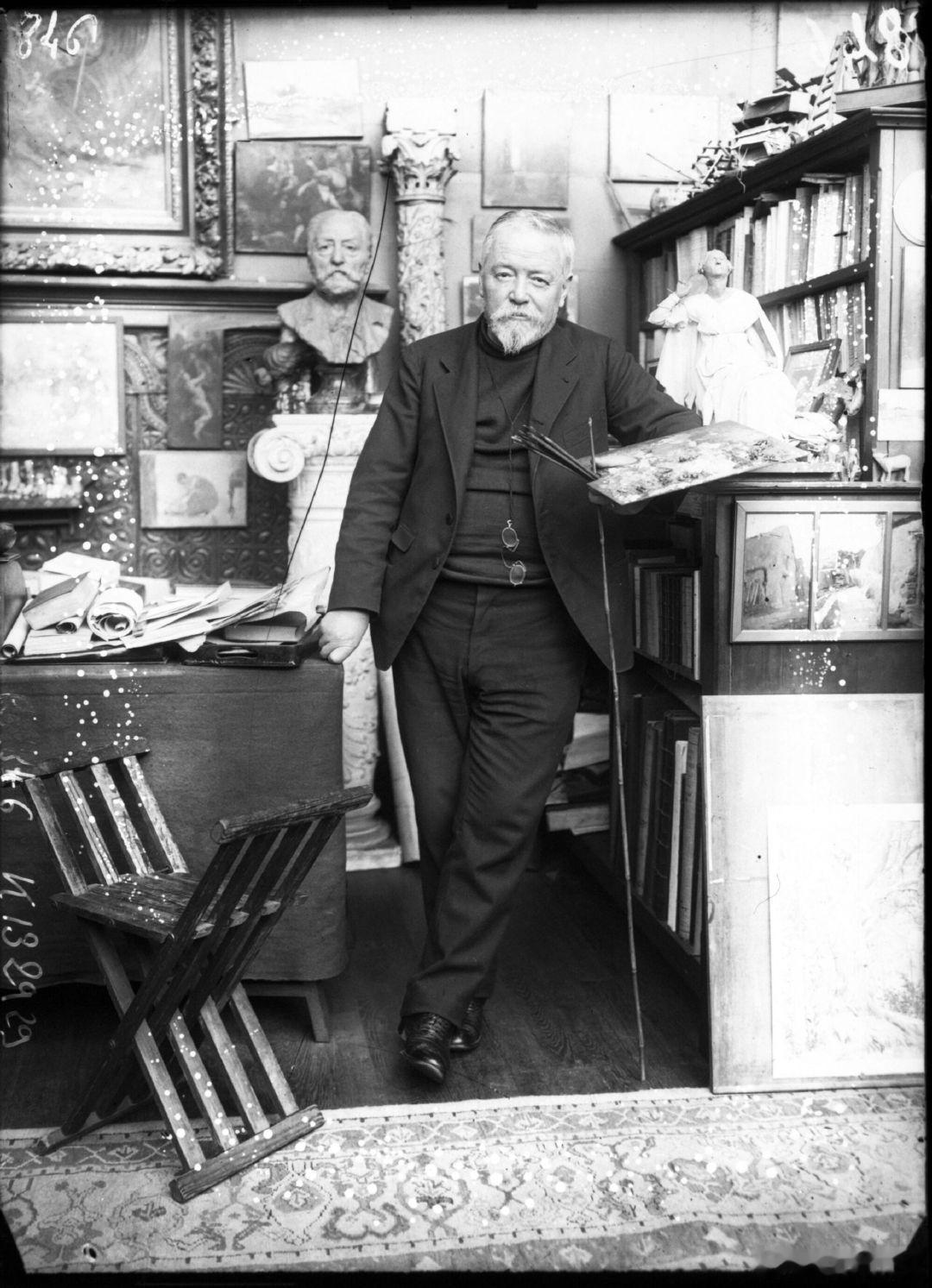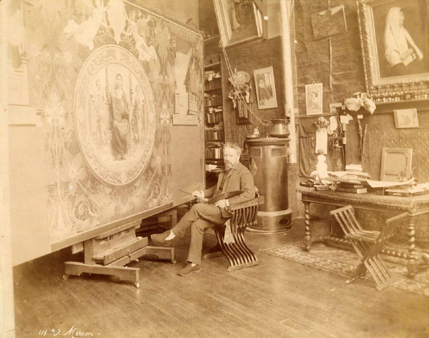 西洋历史文化鱼缸 历史人物 法国学院派画家Luc-Olivier Merson (1846–1920)在他的工作室内。他早年在巴黎美术学院师从Isidore Pils,在1889年巴黎世界博览会上曾获得绘画金奖,1892年当选法兰西艺术院院士。除了绘画,Luc-Olivier Merson在邮票、货币设计上也取得很高成就,另外他还从事彩色花窗玻璃的设计工作。此外他还在巴黎美术学院任教,学生中包括瑞士版画家Martha Cunz。