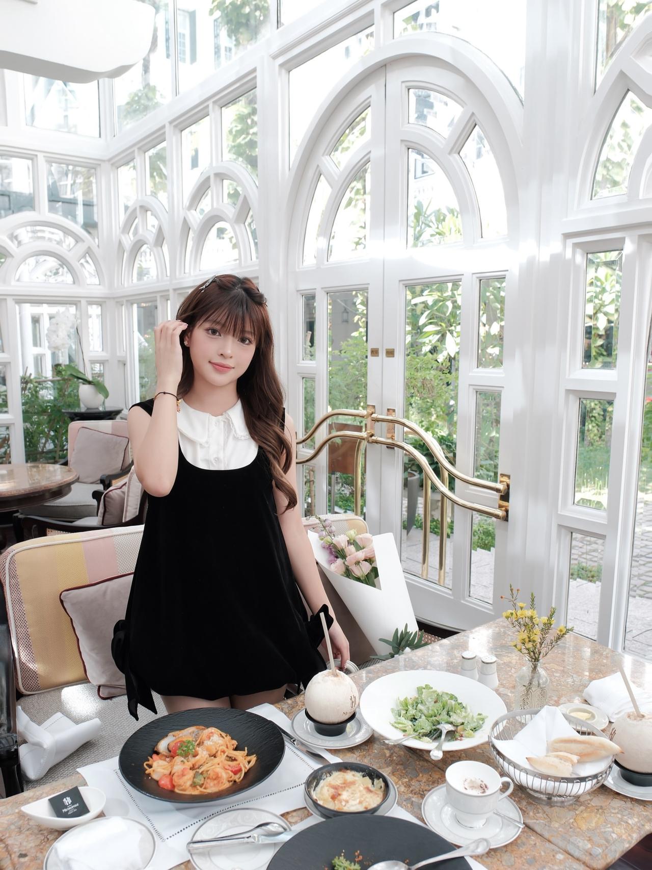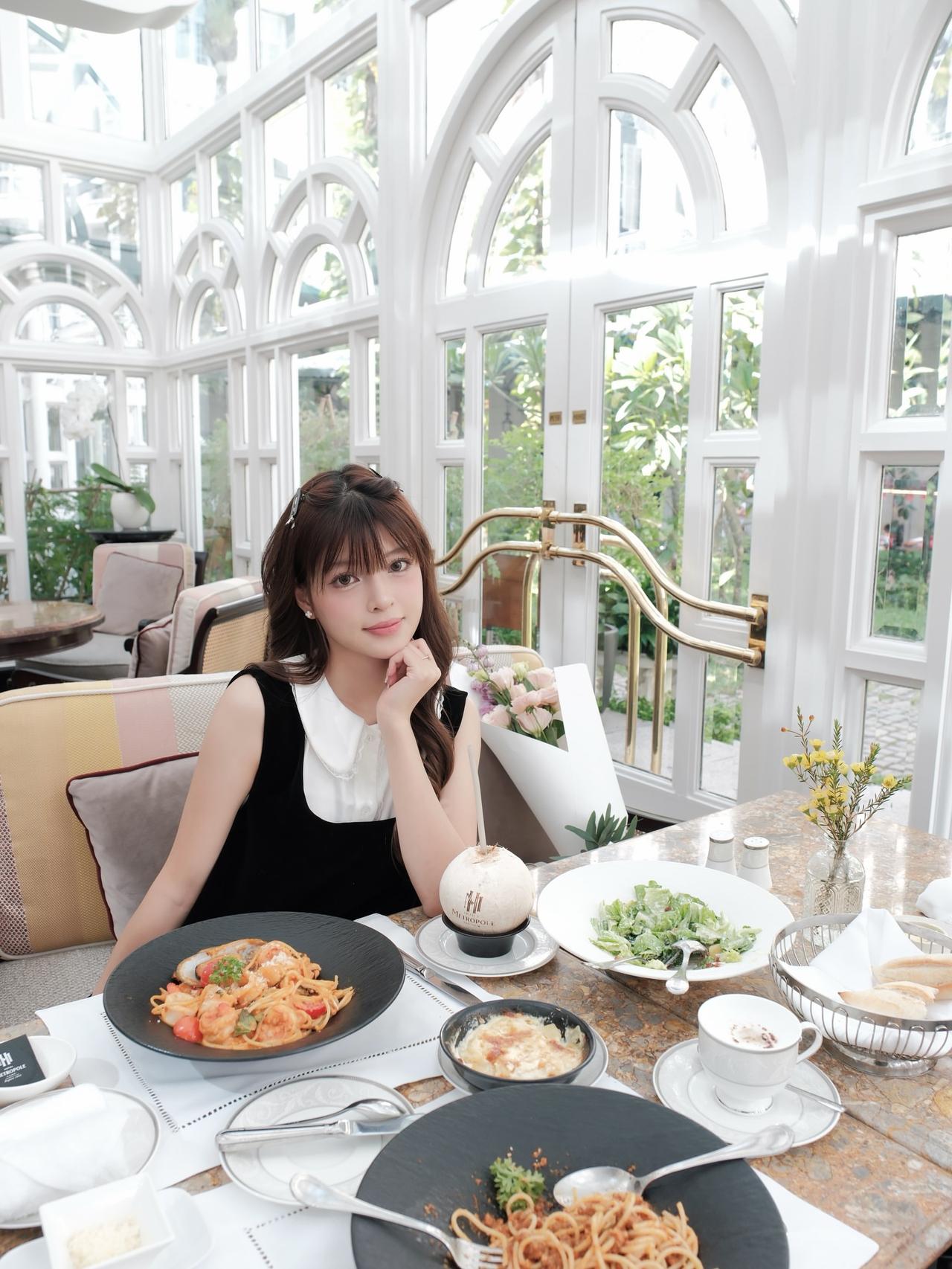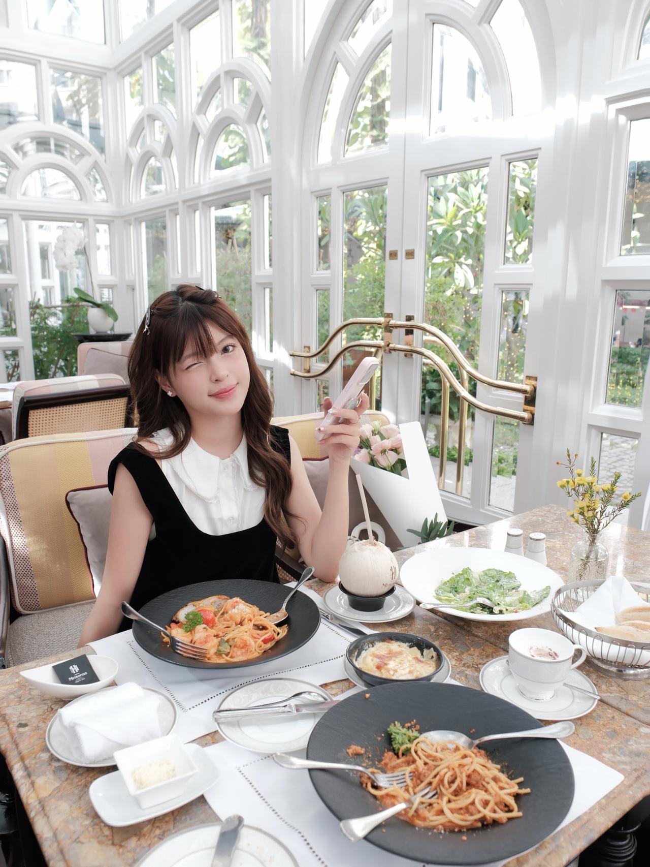 在阳光明媚的咖啡馆里,品尝美食,享受美好时光。🌞🍝🌿美人照怎么拍才好看