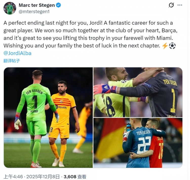 直播吧12月8日讯特尔施特根更新社媒动态,祝福结束职业生涯的老队友阿尔巴。