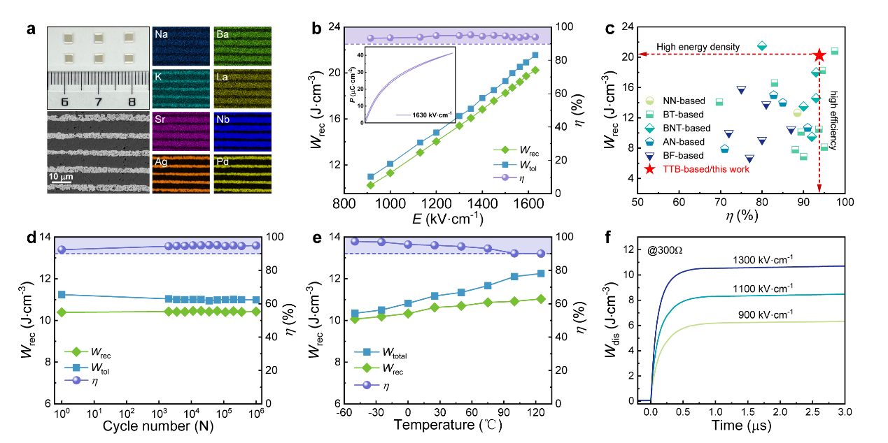 【高熵陶瓷电容器研究取得进展!】高性能介质电容器在现代脉冲功率器件中发挥着关键的作用。然而,能量存储能力低是脉冲器件小型化与集成化趋势面临的主要障碍之一。这导致现有的基于钙钛矿基材料体系的多层陶瓷电容器,正面临着材料设计和器件性能提升的瓶颈。中国科学院上海硅酸盐研究所的团队近期提出了一种创新性策略——基于四方钨青铜(TTB,通式A12A24C4B10O30)结构多位点高熵设计的储能增强策略,打破了传统材料的位点选择性限制,成功实现了电容器性能的显著提升。通过原子尺度分析,研究人员发现这种高熵设计打破了四方钨青铜固有的A1/A2位点选择性,诱导了材料结构的特殊变化:NbO6八面体发生畸变,其中Nb1原子沿特定方向优先位移,Nb2原子则呈现面内无序分布。这种结构变化带来了双重效果:既削弱了长程有序性,又保留了局域尺度的强极化特性。这使得材料在保持高极化强度的同时,降低了能量损耗。团队最终研制出的高熵多层电容器实现了20.2 J·cm⁻³的储能密度和93.8%的储能效率,并展现了出良好的稳定性能。中国科普博览