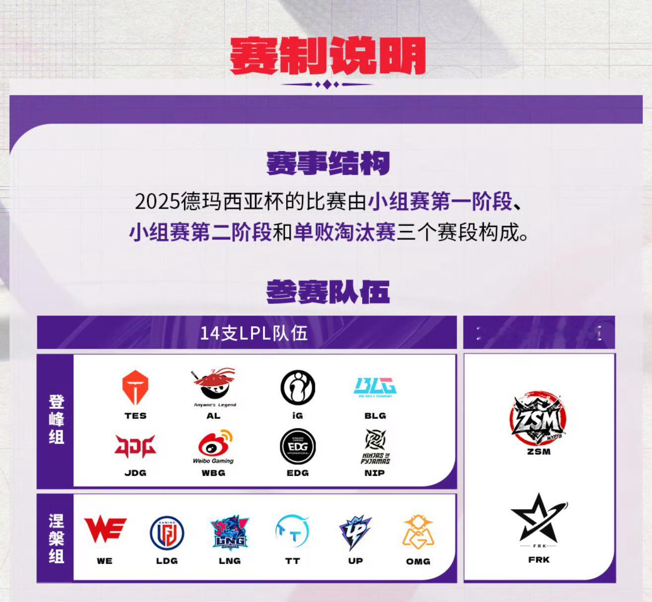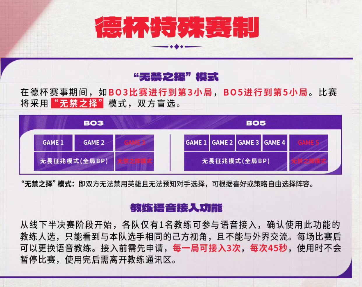盲选回来了!2025德杯赛制与赛程公布:决胜局采用盲选模式以及教练语音功能加入本次德杯中加入特殊规则:1、BO3第三局、BO5第五局开启“无禁之择”盲选模式,双方无ban无pick!2、半决赛起可使用教练语音接入,每局3次45秒实时指导,不暂停比赛登峰组队伍:TES,AL,IG,BLG,JDG,WBG,EDG,NIP涅槃组队伍:WE,LGD,LNG,TT,UP,OMG平台主播队:ZSM,FRK战队德杯赛程公布faker谈gumayusi离开t1英雄联盟