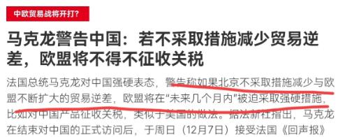 简直不敢相信,这话是从马克龙口中说出来!   刚访华结束,马克龙口风变得非常强硬!12月7日,根据法新社报道,法国总统马克龙接受采访时表示,如果北京不采取措施减少与欧盟不断扩大的贸易逆差,欧盟将在“未来几个月内”被迫采取强硬措施,比如对中国产品征收关税,类似于美国的做法。     这番话,前脚还在北京笑着说合作,后脚就甩出关税威胁,这种转变让人措手不及。其实,从马克龙的语气里能嗅出一股浓烈的不安——不是简单的“逆差焦虑”,而是对欧洲工业地位动摇的担忧。   机床、汽车,这些曾经支撑欧洲骄傲的老产业,如今正在被中国的技术和性价比逼得节节后退,面对这种竞争,他们不想自我变革,反倒盯上了中国市场,打算用关税去“平衡”数字。   马克龙提出的逻辑听起来冠冕堂皇,背后却充满了双重标准。他说欧洲不能总是进口中国货,中国企业要来欧洲投资,但投资必须符合欧洲规则,不能带有“掠夺性”。这等于告诉中国企业:钱要来,方向得我定。   这种“既要又要”,说白了就是在市场开放的幌子下设了重重门槛。市场经济讲究互利和自愿,不可能靠威逼利诱保持平衡。中国企业愿意来欧洲投资,是看中环境和合作前景,不是想去“施舍”谁。   欧洲常拿贸易逆差说事,但真正造成逆差的根源并不在中国。很多高价值产品,比如荷兰的光刻机,中国想买却被禁,欧洲一边说要贸易平衡,一边又对关键领域卡脖子,这样的算账方式本身就没道理。   要真想改善经济,法国和欧洲盟友应该先把内部的出口限制拿掉,让合作自由进行,而不是整天打中国的主意。   更何况,中国一直是欧洲企业的重要客户。无论是空客、宝马,还是法国的奢侈品牌,都在中国赚得盆满钵满,把逆差问题全推给中国,不仅失公允,也掩盖了欧洲自身的结构性弱点。   欧洲目前面对的最大问题,是创新疲软和竞争力下降,跟着美国搞关税战,短期也许能稳住舆论,但长期只会让本国产业失去动力。   马克龙的强硬姿态看似果断,背后却显得有些心虚。贸易问题从来都不是靠威胁解决的,中欧关系几十年发展到今天,不是靠喊口号,而是靠合作共赢。欧洲如果真想在全球竞争中占稳脚跟,就得学会从市场规律出发,而不是动不动就甩出“关税警告”。     对于这种态度,中国早已见惯不怪。我们欢迎合作,但绝不接受胁迫,欧洲如果真想共同发展,我们的大门永远敞开;若是选择对抗,中国也不会退让。   毕竟,合作要靠互信,不是靠权力。接下来,我们只需看他们怎么做,听其言、观其行。