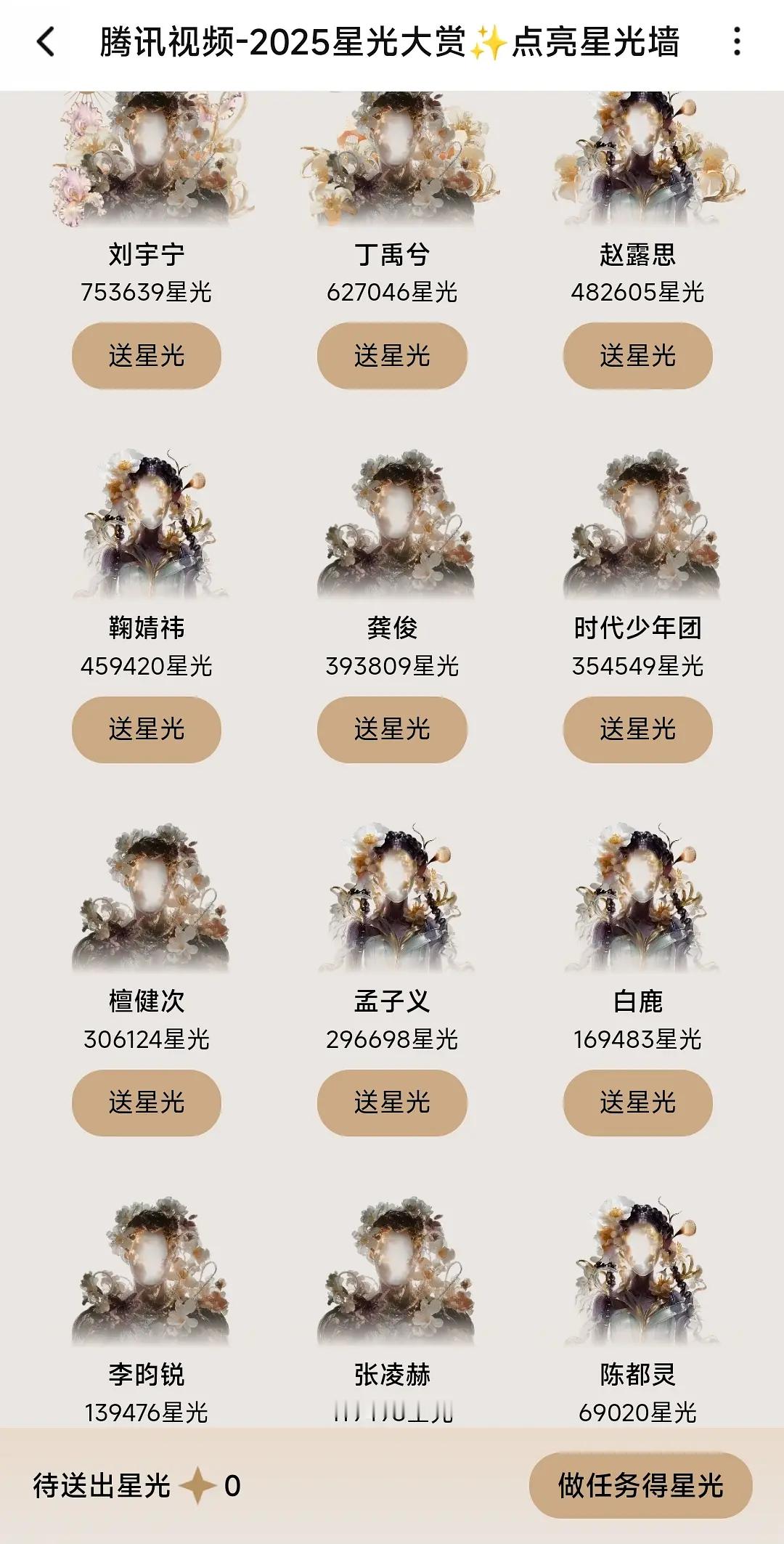 星光大赏的星光墙去年top是刘宇宁 今年时团加入投票后感觉会慢慢发力