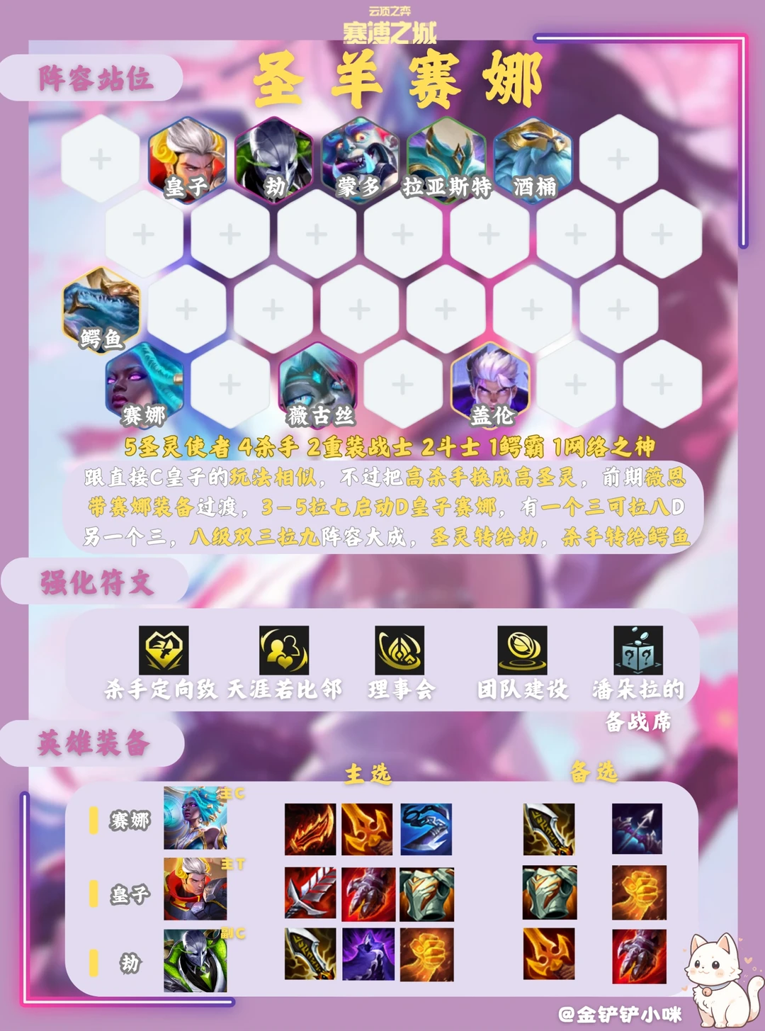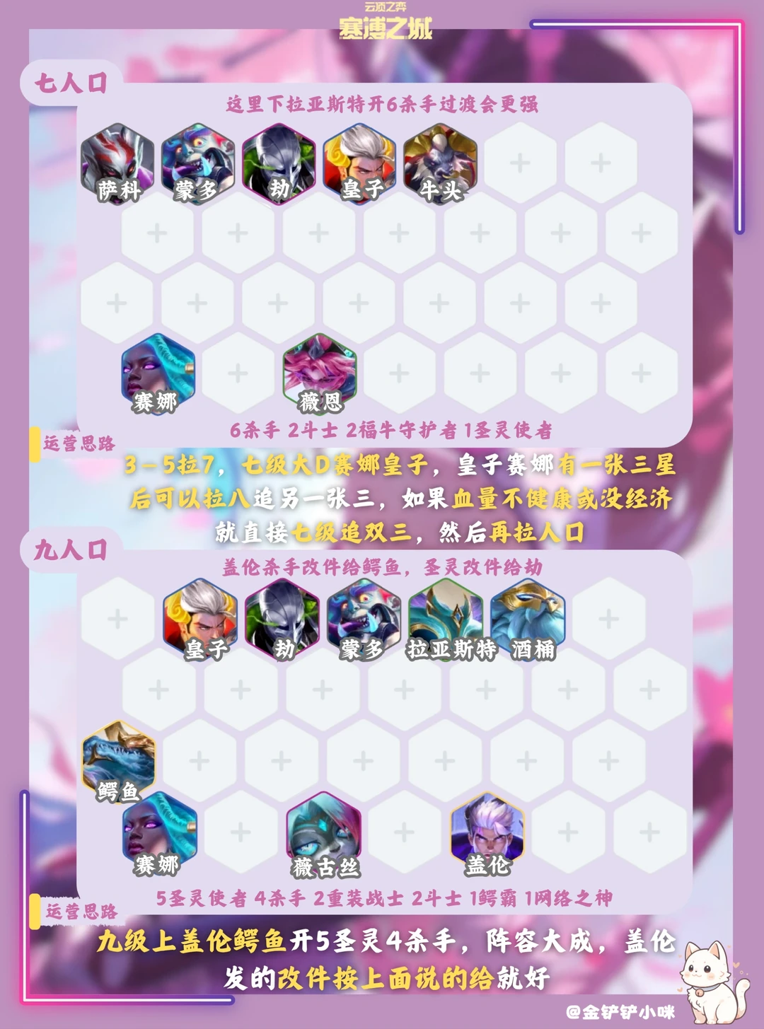 4️⃣阶段八人口找到赛娜皇子三星再拉九级,都被同行拿完想吃分就拉九级找鳄鱼盖伦,盖伦杀手改件给鳄鱼,圣灵改件给劫,有转职同理,阵容大成!