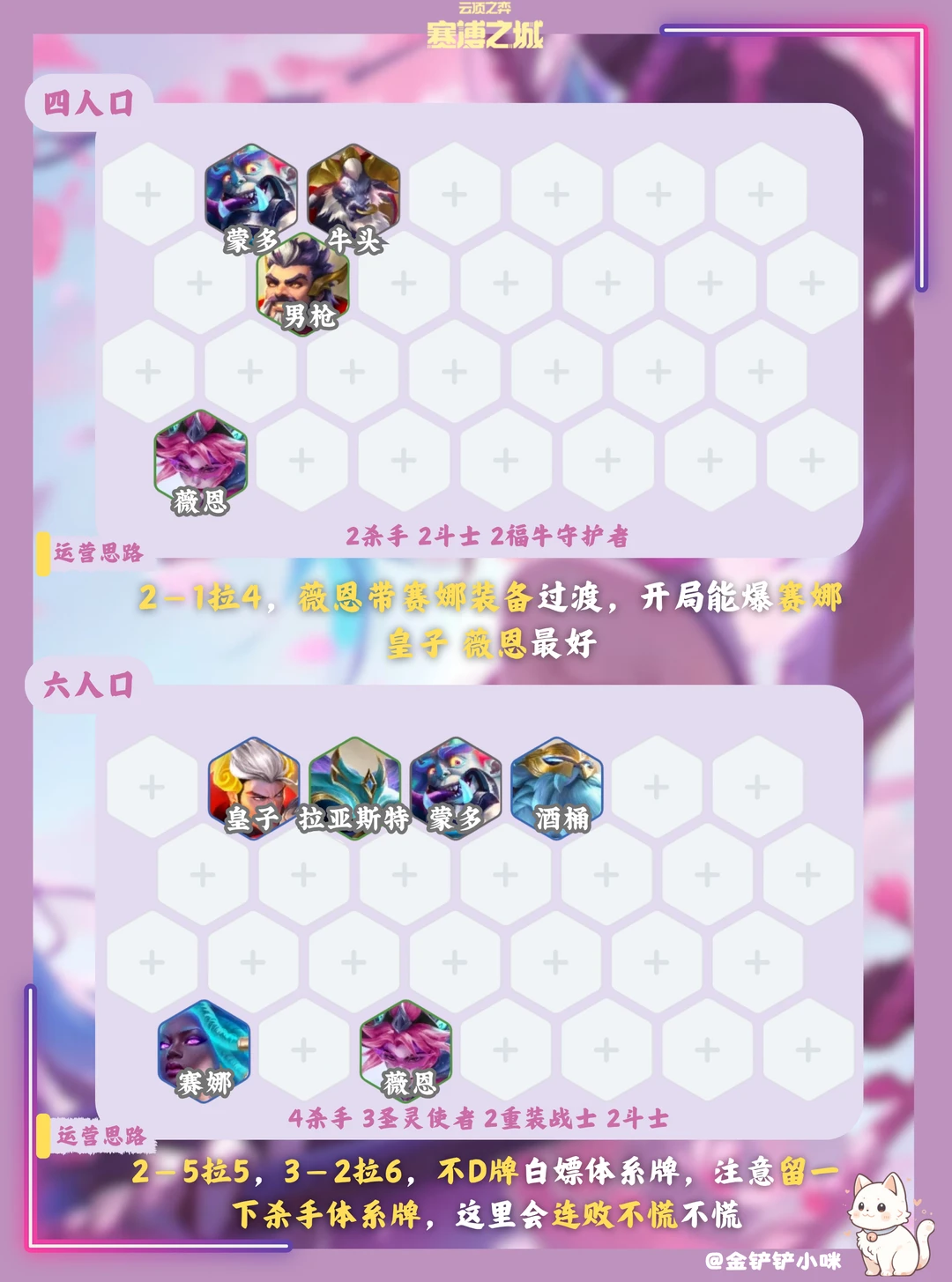2️⃣阶段2-1拉4,2-5拉5,前期薇恩带赛娜装备过渡,不D牌白嫖体系牌,记得留杀手体系牌如果卡利息就不留!