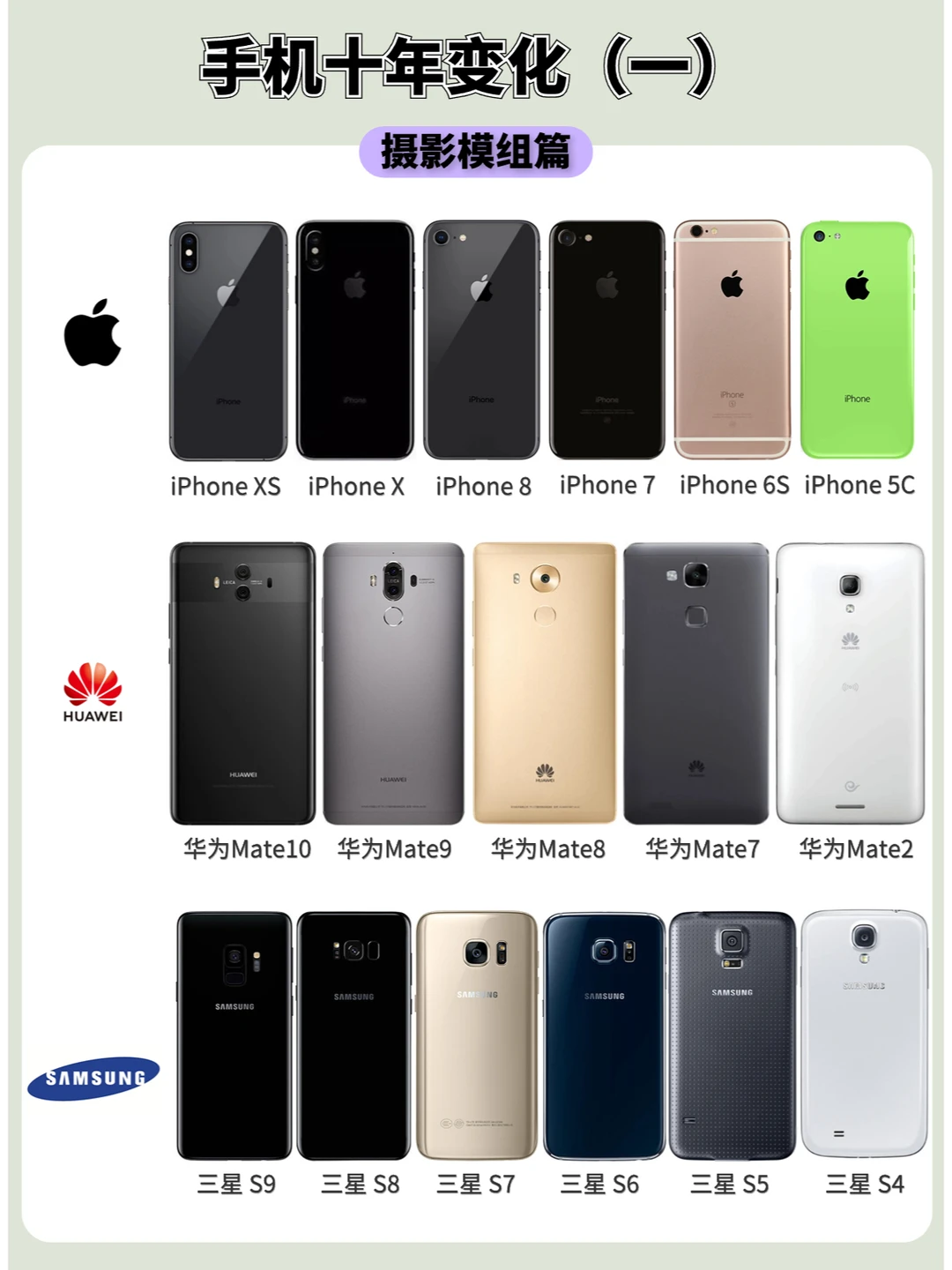 这期笔记展示的是苹果、华为、三星三个品牌三个品牌十年间后置模组的变化。 分别是: 苹果的标准系列; 华为的Mate 系列; 三星的Galaxy S 系列;