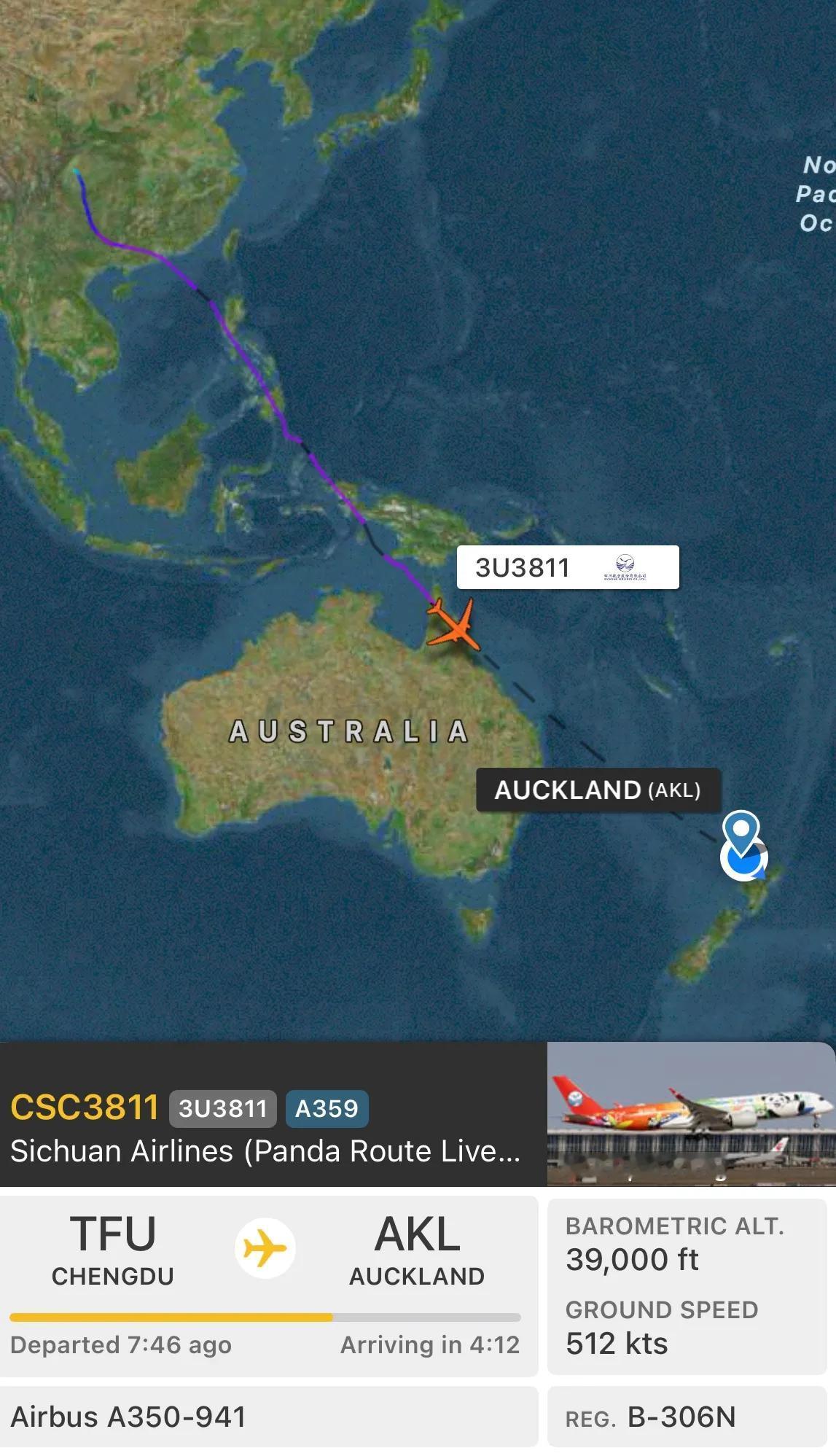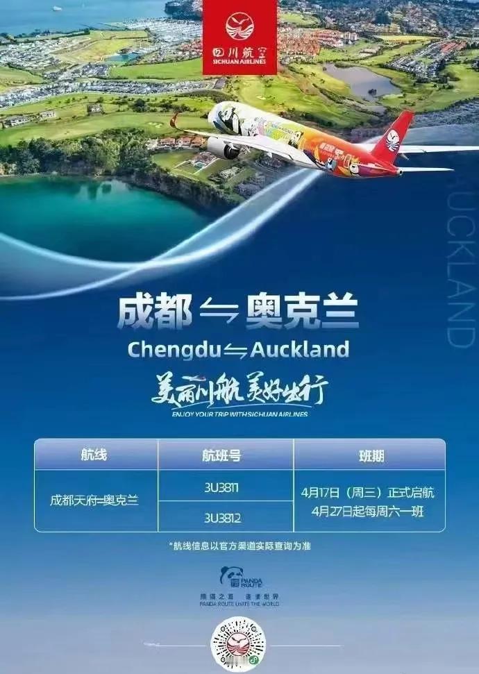 川航成都直飞奥克兰复航!中西部唯一直飞新西兰航线 四川航空成都直飞奥克兰的航线12月7号正式复航啦,这可是现在中西部地区唯一能直飞新西兰的客运航线,以后去新西兰更方便了! 给大家说下航班关键信息:用的是空客A350超宽体客机,坐着挺舒服;每周飞两班,周四和周日各一班;单程飞12到13小时,不用中途转机折腾。去程航班号3U3811,凌晨1点30分从成都天府机场起飞,当地时间18点40分到奥克兰;返程3U3812,奥克兰22点起飞,北京时间第二天早上5点35分回到成都。 首航特别顺利,12月7号凌晨起飞的航班,载着257名旅客,当地时间18点43分就安全到奥克兰了。这条航线复航太实用了:以前中西部去新西兰可能要转机,现在有了直飞通道,省了不少时间;而且天府机场中转方便,能轻松转到国内其他大城市;不管是去新西兰旅游、做生意,还是两国人文交流,都多了条便捷路线。 另外说下,川航从成都出发,还能直飞澳大利亚的悉尼和墨尔本,去大洋洲的选择挺全的。 成都新西兰中心 成都飞奥克兰