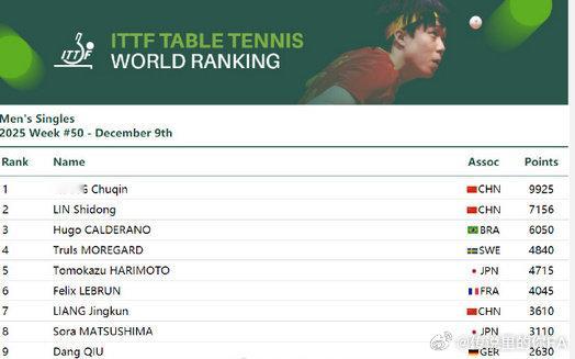 国际乒联2025第50周排名孙颖莎连续178周女单第一 国际乒联公布2025年第
