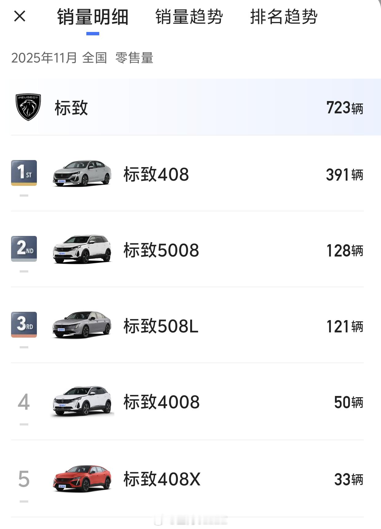 雪佛兰11月零售总销量230台,标致11月零售总销量723台,雪铁龙11月零售总